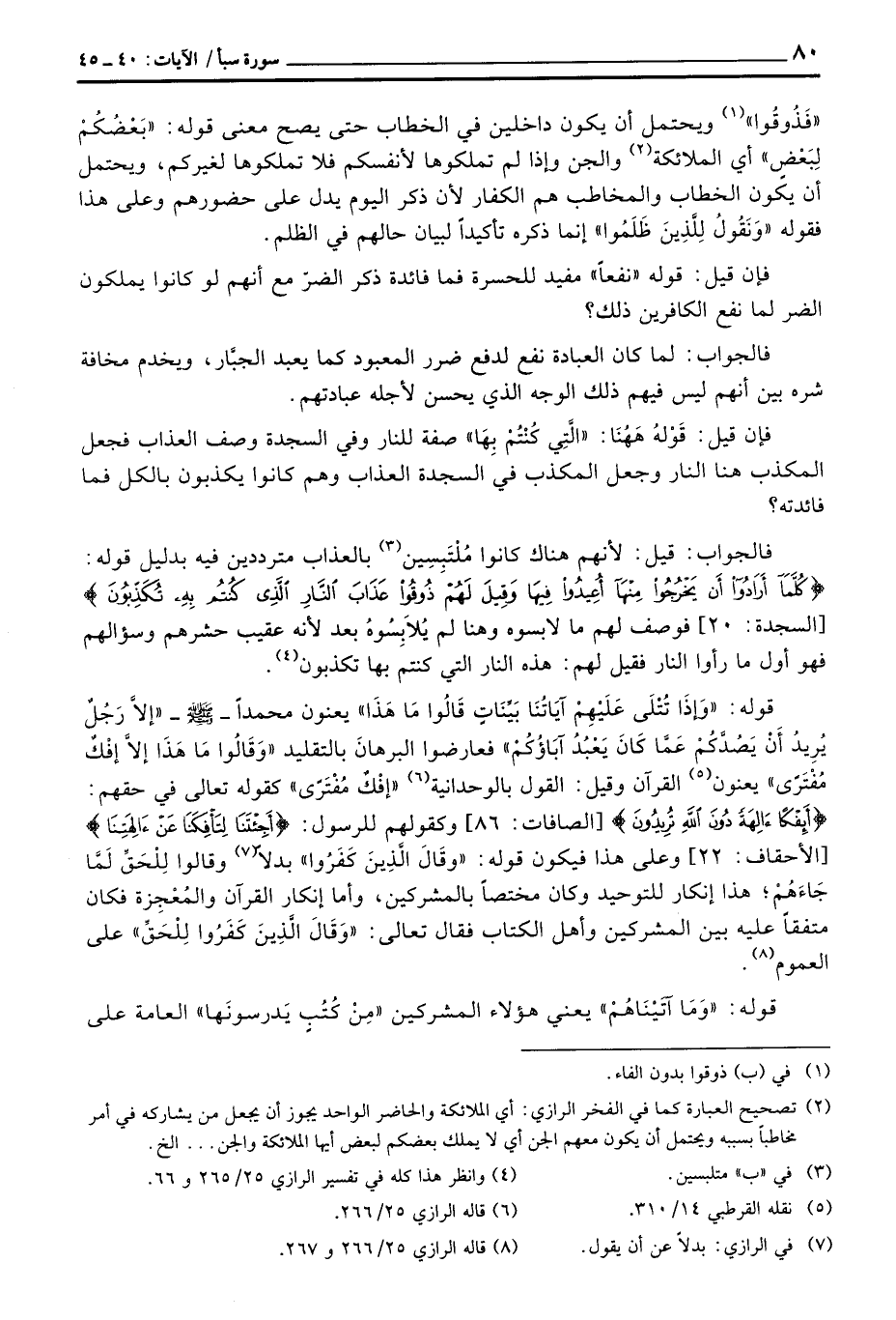 قوله: {وَإِذَا تتلى عَلَيْهِمْ آيَاتُنَا بَيِّنَاتٍ قَالُواْ مَا هذا} يعنون محمداً - صَلَّى اللَّهُ عَلَيْهِ وَسَلَّم َ -» إلاَّ رَجُلٌ يُريدُ أنْ يَصْدَّكُمْ عَمَّا كَانَ يَعْبُدُ آبَاؤُكُمْ «فعارضوا الرهانَ بالتقليد» وَقَالُوا مَا هَذَا إلاَّ إفْكٌ مُفْتَرى «يعنون القرآن وقيل: القول بالوحدانية» إفْكٌ مُفْتَرًى «كقوله تعالى في حقهم: {أَإِفْكاً آلِهَةً دُونَ الله تُرِيدُونَ} [الصفات: 86] وكقولهم للرسول: {قالوا أَجِئْتَنَا لِتَأْفِكَنَا عَنْ آلِهَتِنَا} [الأحقاف: 22] وعلى هذا فيكون قوله: {وَقَالَ الذين كَفَرُواْ} بدلاً وقالوا لِلْحَقِّ لَمَّا جَاءَهُمْ؛ هذا إنكار للتوحيد وكان مختصاً بالمشركين، وأما إنكار القرآن والمُعْجِزة فكان متفقاً عليه بين المشركين وأهل الكتاب فقال تعالى: {وَقَالَ الذين كَفَرُواْ لِلْحَقِّ} على العموم.