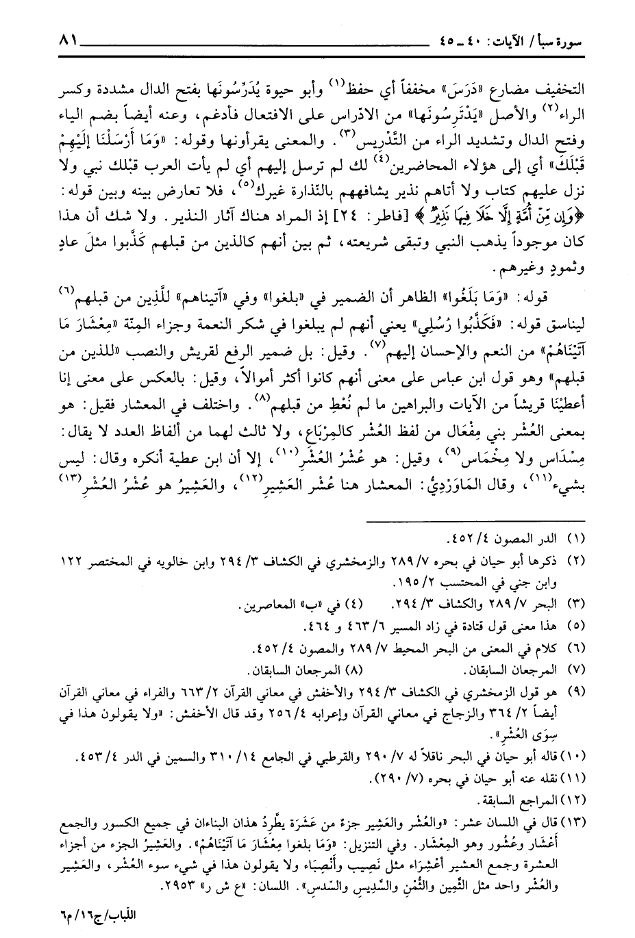 قوله: {وَمَا بَلَغُوا} الظاهر أن الضمير في «بلغوا» وفي «آتيناهم» للَّذِين من قبله ليناسق قوله: {فَكَذَّبُوا رُسُلِي} يعني أنهم لم يبلغوا في شكر النعمة وجزاء المِنّة «مِعْشَارَ مَا آتَيْنَاهُمْ» من النعم والإحسان إليهم. وقيل: بل ضمير الرفع لقريش والنصب «للذين من قبلهم» وهو قول ابن عباس على معنى أنهم كانوا أموالاً، وقيل: بالعكس على معنى إنا أعطيْنَا قريشاً من الآيات والبراهين ما لم نُعْطِ من قبلهم. واختلق في المشعار فقيل: هو بمعنى العُشْر بني مِفْعَال من لفظ العُشْر كالمِرْبَاع، ولا ثالث لهما من ألفاظ العدد لا يقال: مِسْدَاس ولا مِخْمَاس، وقيل: هو عُشْرُ العُشْرِ، إلا أن ابن عطية أنكره وقال: ليس بشيء وقال المَاوَرْدِيُّ: المعشار هنا عُشْر العَشِيرِ، والعَشِيرُ هو عُشْرُ العُشْرِ.
