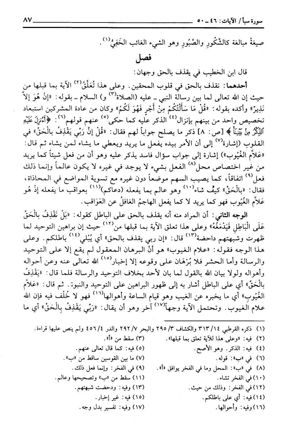 قال ابن الخطيب في يقذف بالحق وجهان: أحدهما: نقذف بالحق في قلوب المحقين. وعلى هذا تُعَلَّقُ الآية بما قبلها من حيث إن الله تعالى لما بين رسالة النبي - عليه (الصلاة و) السلام - بقوله: {إنْ هُوَ إلاَّ نَذِيرٌ} وأكده بقوله: {قُلْ مَا سَأَلْتُكُم مِّن أَجْرٍ فَهُوَ لَكُم} وكان من عادة المشركين استعباد تخصيص واحد من بينهم بإنزال الذكر عليه كما حكى عنهم قولهم: {أَأُنزِلَ عَلَيْهِ الذكر مِن بَيْنِنَا} [ص: 8] ذكر ما يصلح جواباً لهم فقال: {قُلْ إِنَّ رَبِّي يَقْذِفُ بالحق} في القلوب (إشارة إلى أن الأمر بيده يفعل ما يريد ويعطي ما يشاء كما يريد من غير اختصاص محل الفعل بشيء لا يوجد في غيره لا يكون عالماً وإنما ذلك فعل اتفاقاً، كما يصيب السهم موضعاً دون غيره مع تسوية المواضع في المحاذاة، فقال: «بالْحقِّ» كيف شاء وهو عالم بما يفعله (دعاكم) بعواقب ما يفعله إذْ هُو عَلاَّم الغُيُوب فهو كما يريد لا كما يفعل الهاجمُ الغافلُ عن العَوَاقب.