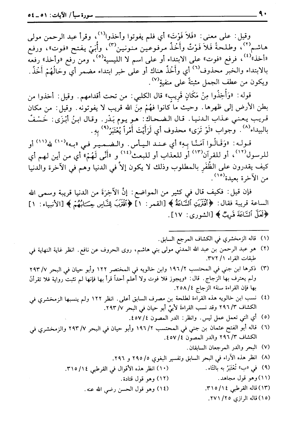 وقيل: على معنى: «فَلاَ فَوْتَ» أي فلم يفوتوا وأخذوا وقرأ عبد الرحمن مولى هاشم وطلحةُ فَلاَ فَوْتٌ وأَخْذٌ مرفوعين منونين، وأُبَيّ يفتح «فوت» ، ورفع «أخذ» ، فرفع «فوت» على الابتداء أو على اسم لا الليسية ومن رفع «وأخذ» رفعه بالابتداء والخبر محذوف أي وأَخْذٌ هناك أو على خبر ابتداء مضمر أي وَحالُهُمْ أَخْذٌ.