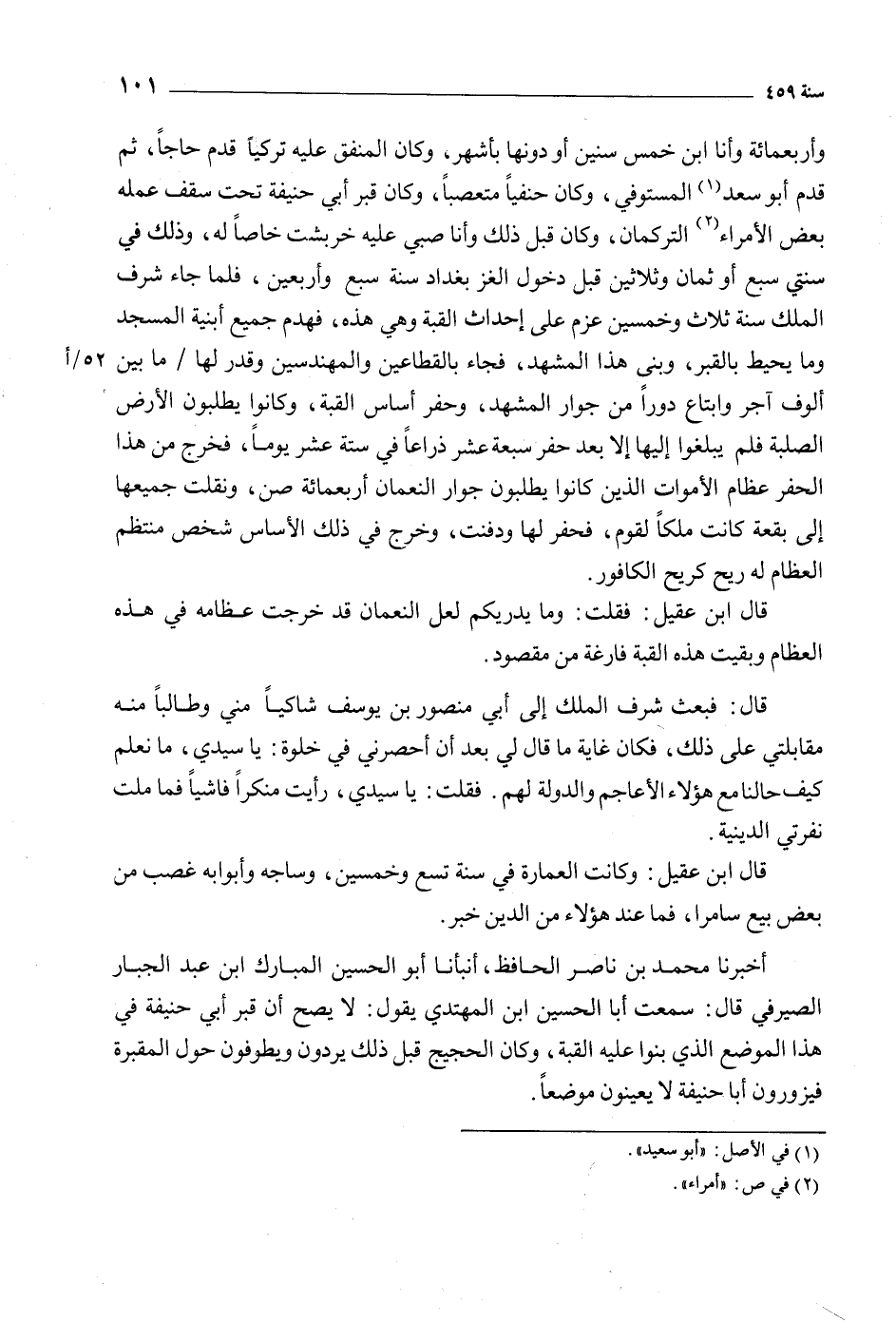 وأربعمائة وأنا ابن خمس سنين أو دونها بأشهر، وكان المنفق عليه تركيا قدم حاجا، ثم قدم أبو سعد [1] المستوفي، وكان حنفيا متعصبا، وكان قبر أبي حنيفة تحت سقف عمله بعض الأمراء [2] التركمان، وكان قبل ذلك وأنا صبي عليه خربشت خاصا له، وذلك في سنتي سبع أو ثمان وثلاثين قبل دخول الغز بغداد سنة سبع وأربعين، فلما جاء شرف الملك سنة ثلاث وخمسين عزم على إحداث القبة وهي هذه، فهدم جميع أبنية المسجد وما يحيط بالقبر، وبنى هذا المشهد، فجاء بالقطاعين والمهندسين وقدر لها/ ما بين 52/ أألوف آجر وابتاع دورا من جوار المشهد، وحفر أساس القبة، وكانوا يطلبون الأرض الصلبة فلم يبلغوا إليها إلا بعد حفر سبعة عشر ذراعا في ستة عشر يوما، فخرج من هذا الحفر عظام الأموات الذين كانوا يطلبون جوار النعمان أربعمائة صن، ونقلت جميعها إلى بقعة كانت ملكا لقوم، فحفر لها ودفنت، وخرج في ذلك الأساس شخص منتظم العظام له ريح كريح الكافور.