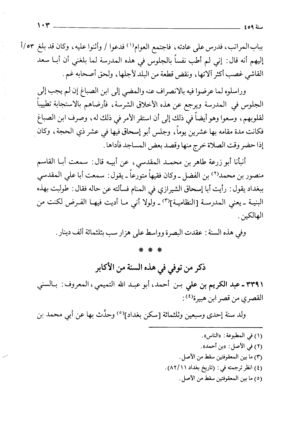 أنبأنا أبو زرعة طاهر بن محمد المقدسي، عن أبيه قَالَ: سمعت أبا القاسم منصور بن محمد [2] بن الفضل- وكان فقيها متورعا- يقول: سمعت أبا علي المقدسي ببغداد يقول: رأيت أبا إسحاق الشيرازي في المنام فسألته عن حاله فقال: طولبت بهذه البنية- يعني المدرسة [النظامية] [3]- ولولا أني ما أديت فيها الفرض لكنت من الهالكين.