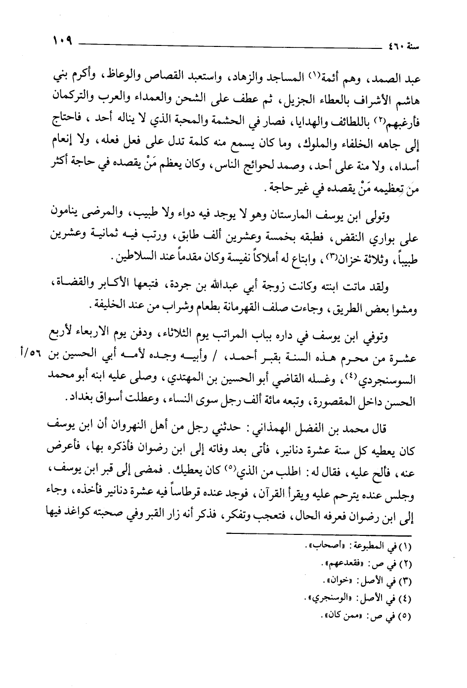 عبد الصمد، وهم أئمة [1] المساجد والزهاد، واستعبد القصاص والوعاظ، وأكرم بني هاشم الأشراف بالعطاء الجزيل، ثم عطف على الشحن والعمداء والعرب والتركمان فأرغبهم [2] باللطائف والهدايا، فصار في الحشمة والمحبة الذي لا يناله أحد، فاحتاج إلى جاهه الخلفاء والملوك، وما كان يسمع منه كلمة تدل على فعل فعله، ولا إنعام أسداه، ولا منة على أحد، وصمد لحوائج الناس، وكان يعظم من يقصده في حاجة أكثر من تعظيمه من يقصده في غير حاجة.