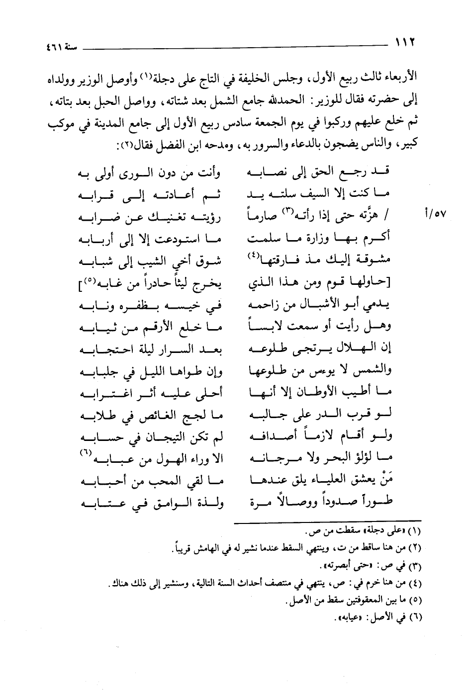 الأربعاء ثالث ربيع الأول، وجلس الخليفة في التاج على دجلة [1] وأوصل الوزير وولداه إلى حضرته فقال للوزير: الحمد للَّه جامع الشمل بعد شتاته، وواصل الحبل بعد بتاته، ثم خلع عليهم وركبوا في يوم الجمعة سادس ربيع الأول إلى جامع المدينة في موكب كبير، والناس يضجون بالدعاء والسرور به، ومدحه ابن الفضل فقال [2] :