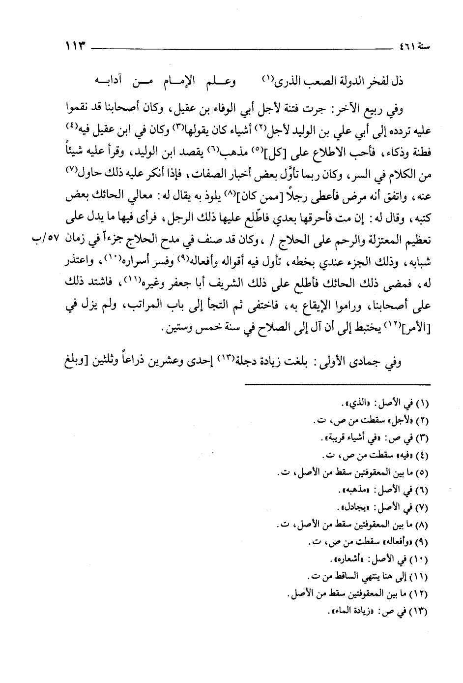 وفي ربيع الآخر: جرت فتنة لأجل أبي الوفاء بن عقيل، وكان أصحابنا قد نقموا عليه تردده إلى أبي علي بن الوليد لأجل [2] أشياء كان يقولها [3] وكان في ابن عقيل فيه [4] فطنة وذكاء، فأحب الاطلاع على [كل] [5] مذهب [6] يقصد ابن الوليد، وقرأ عليه شيئا من الكلام في السر، وكان ربما تأول بعض أخبار الصفات، فإذا أنكر عليه ذلك حاول [7] عنه، واتفق أنه مرض فأعطى رجلا [ممن كان] [8] يلوذ به يقال له: معالي الحائك بعض كتبه، وقال له: إن مت فأحرقها بعدي فاطلع عليها ذلك الرجل، فرأى فيها ما يدل على تعظيم المعتزلة والرحم على الحلاج/، وكان قد صنف في مدح الحلاج جزء في زمان 57/ ب شبابه، وذلك الجزء عندي بخطه، تأول فيه أقواله وأفعاله [9] وفسر أسراره [10] ، واعتذر له، فمضى ذلك الحائك فأطلع على ذلك الشريف أبا جعفر وغيره [11] ، فاشتد ذلك على أصحابنا، وراموا الإيقاع به، فاختفى ثم التجأ إلى باب المراتب، ولم يزل في [الأمر] [12] يختبط إلى أن آل إلى الصلاح في سنة خمس وستين.