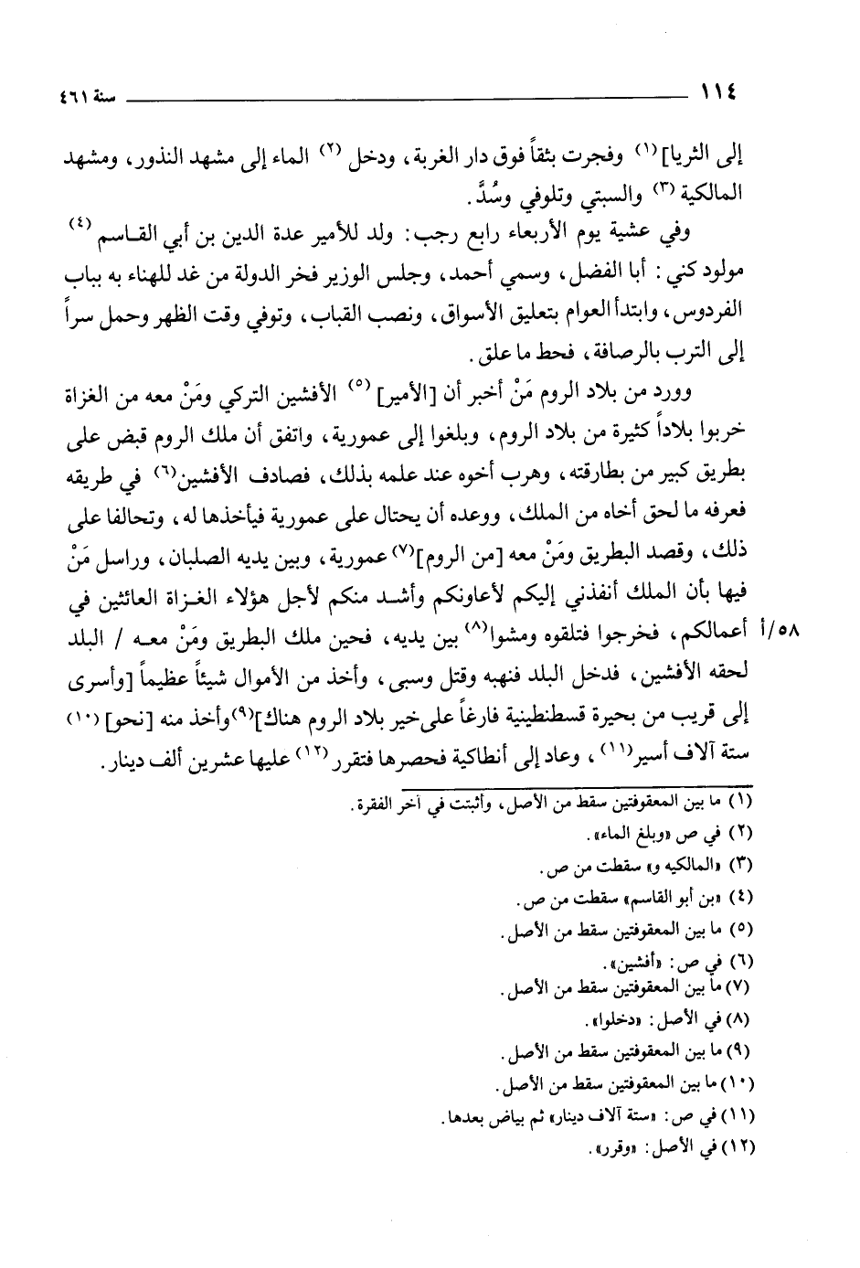 وورد من بلاد الروم من أخبر أن [الأمير] [5] الأفشين التركي ومن معه من الغزاة خربوا بلادا كثيرة من بلاد الروم، وبلغوا إلى عمورية، واتفق أن ملك الروم قبض على بطريق كبير من بطارقته، وهرب أخوه عند علمه بذلك، فصادف الأفشين [6] في طريقه فعرفه ما لحق أخاه من الملك، ووعده أن يحتال على عمورية فيأخذها له، وتحالفا علي ذلك، وقصد البطريق ومن معه [من الروم] [7] عمورية، وبين يديه الصلبان، وراسل من فيها بأن الملك أنفذني إليكم لأعاونكم وأشد منكم لأجل هؤلاء الغزاة العائثين في 58/ أأعمالكم، فخرجوا فتلقوه ومشوا [8] بين يديه، فحين ملك البطريق ومن معه/ البلد لحقه الأفشين، فدخل البلد فنهبه وقتل وسبى، وأخذ من الأموال شيئا عظيما [وأسرى إلى قريب من بحيرة قسطنطينية فارغا على خير بلاد الروم هناك] [9] وأخذ منه [نحو] [10] ستة آلاف أسير [11] ، وعاد إلى أنطاكية فحصرها فتقرر [12] عليها عشرين ألف دينار.