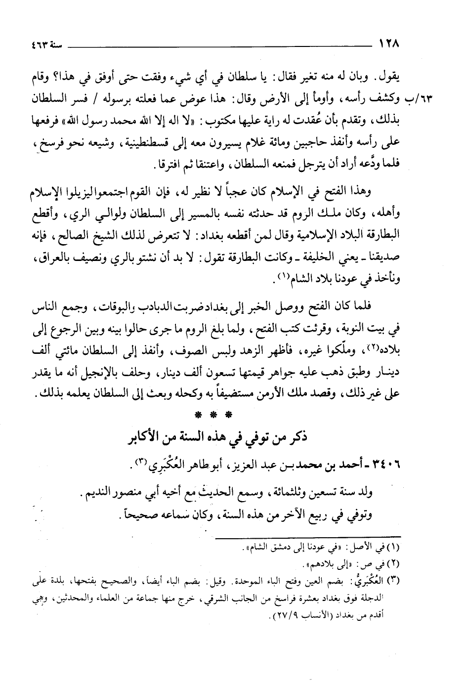 [3] العكبريّ: بضم العين وفتح الباء الموحدة. وقيل: بضم الباء أيضا، والصحيح بفتحها، بلدة على الدجلة فوق بغداد بعشرة فراسخ من الجانب الشرقي، خرج منها جماعة من العلماء والمحدثين، وهي أقدم من بغداد (الأنساب 9/ 27) .