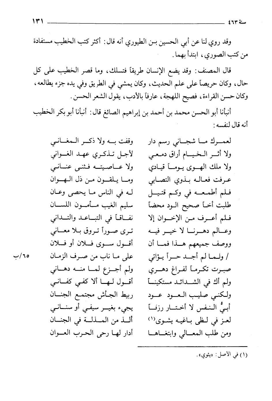 أنبأنا أبو الحسن محمد بن أحمد بن إبراهيم الصائغ قَالَ: أنبأنا أبو بكر الخطيب أنه قَالَ لنفسه: