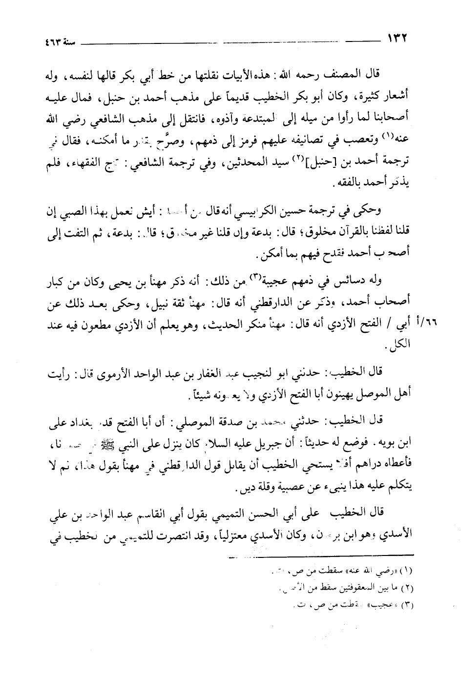 قَالَ المصنف رحمة الله: هذه الأبيات نقلتها من خط أبي بكر قالها لنفسه، وله أشعار كثيرة، وكان أبو بكر الخطيب قديما على مذهب أحمد بن حنبل، فمال عليه أصحابنا لما رأوا من ميله إلى المبتدعة وآذوه، فانتقل إلى مذهب الشافعي رضي الله عنه [1] وتعصب في تصانيفه عليهم فرمز إلى ذمهم، وصرح بقدر ما أمكنه، فقال في ترجمة أحمد بن [حنبل] [2] سيد المحدثين، وفي ترجمة الشافعي: تاج الفقهاء، فلم يذكر أحمد بالفقه.