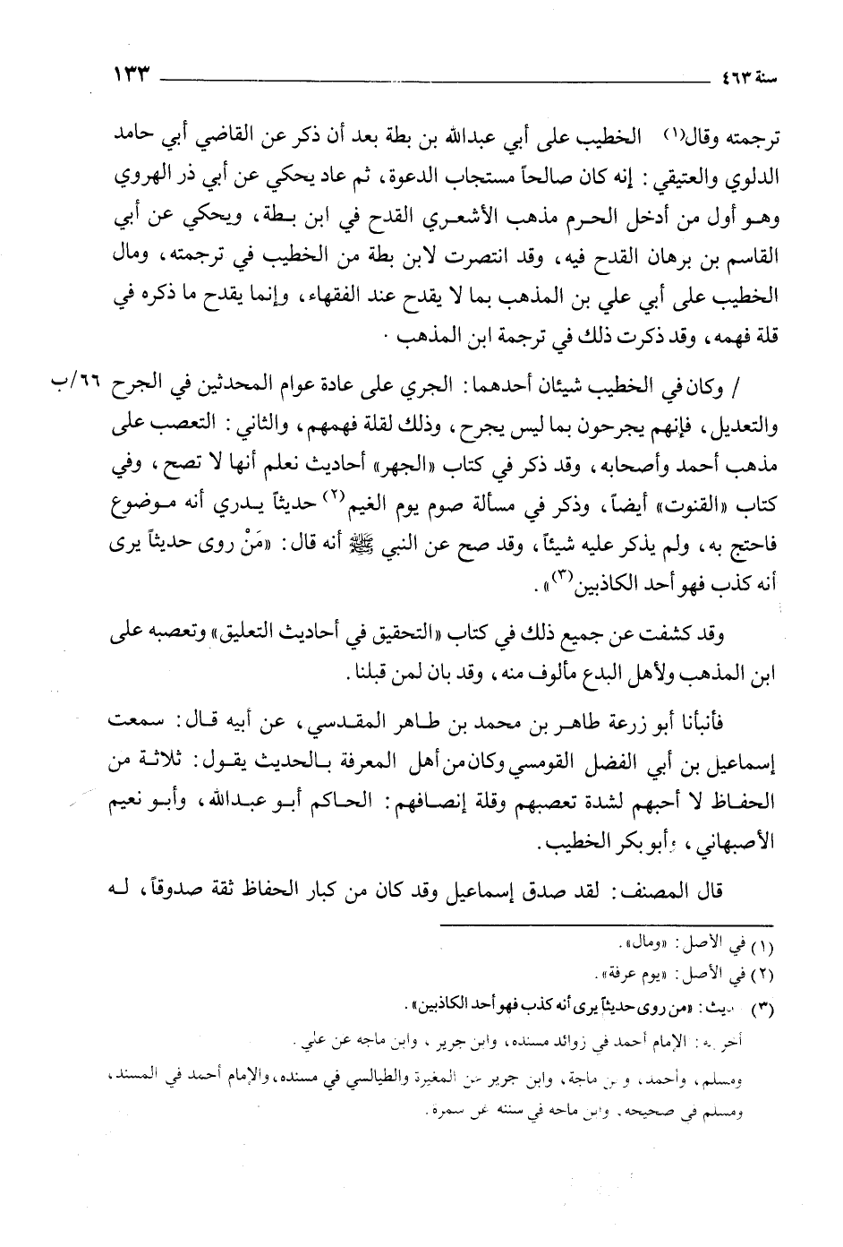 / وكان في الخطيب شيئان أحدهما: الجري على عادة عوام المحدثين في الجرح 66/ ب والتعديل، فإنهم يجرحون بما ليس يجرح، وذلك لقلة فهمهم، والثاني: التعصب على مذهب أحمد وأصحابه، وقد ذكر في كتاب «الجهر» أحاديث نعلم أنها لا تصح، وفي كتاب «القنوت» أيضا، وذكر في مسألة صوم يوم الغيم [2] حديثا يدرى أنه موضوع فاحتج به، ولم يذكر عليه شيئا، وَقَدْ صَحَّ عَنِ النَّبِيِّ صَلَّى اللَّهُ عَلَيْهِ وَسَلَّمَ أَنَّهُ قَالَ: «مَنْ رَوَى حَدِيثًا يَرَى أَنَّهُ كَذِبٌ فَهُوَ أَحَدُ الكاذبين [3] » .