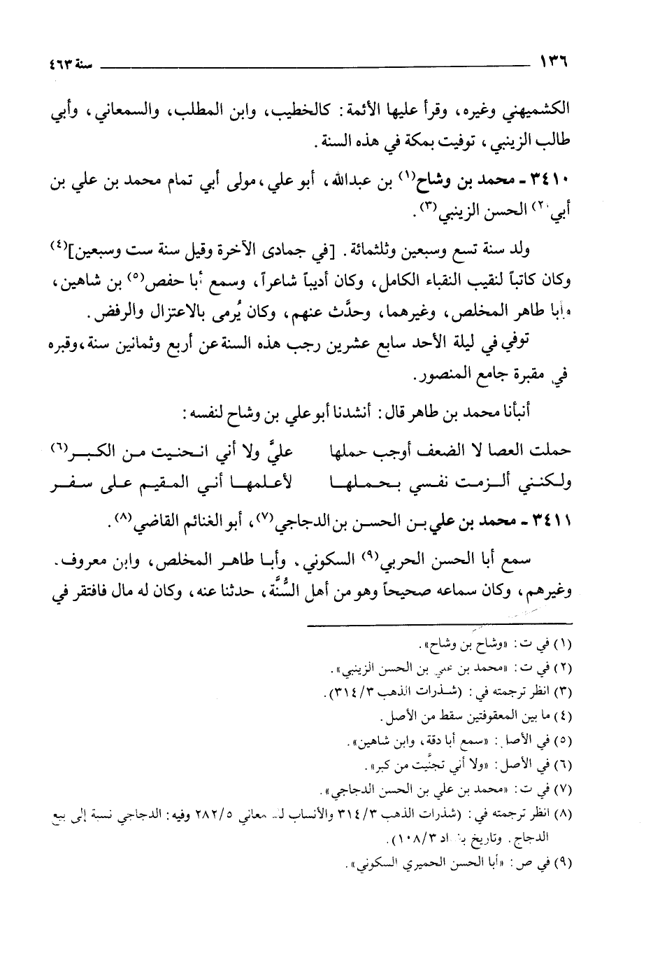 [8] انظر ترجمته في: (شذرات الذهب 3/ 314 والأنساب للسمعاني 5/ 282 وفيه: الدجاجيّ نسبة إلى بيع الدجاج. وتاريخ بغداد 3/ 108) .