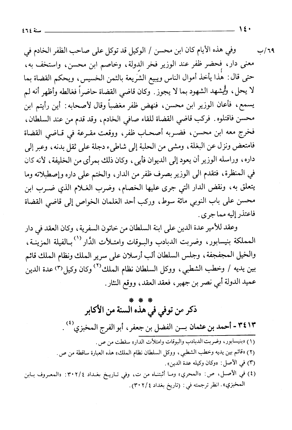 [4] في الأصل، ص: «المحري» وما أثبتناه من ت، وفي تاريخ بغداد 4/ 302: «المعروف بابن المخبزي» . انظر ترجمته في: (تاريخ بغداد 4/ 302) .