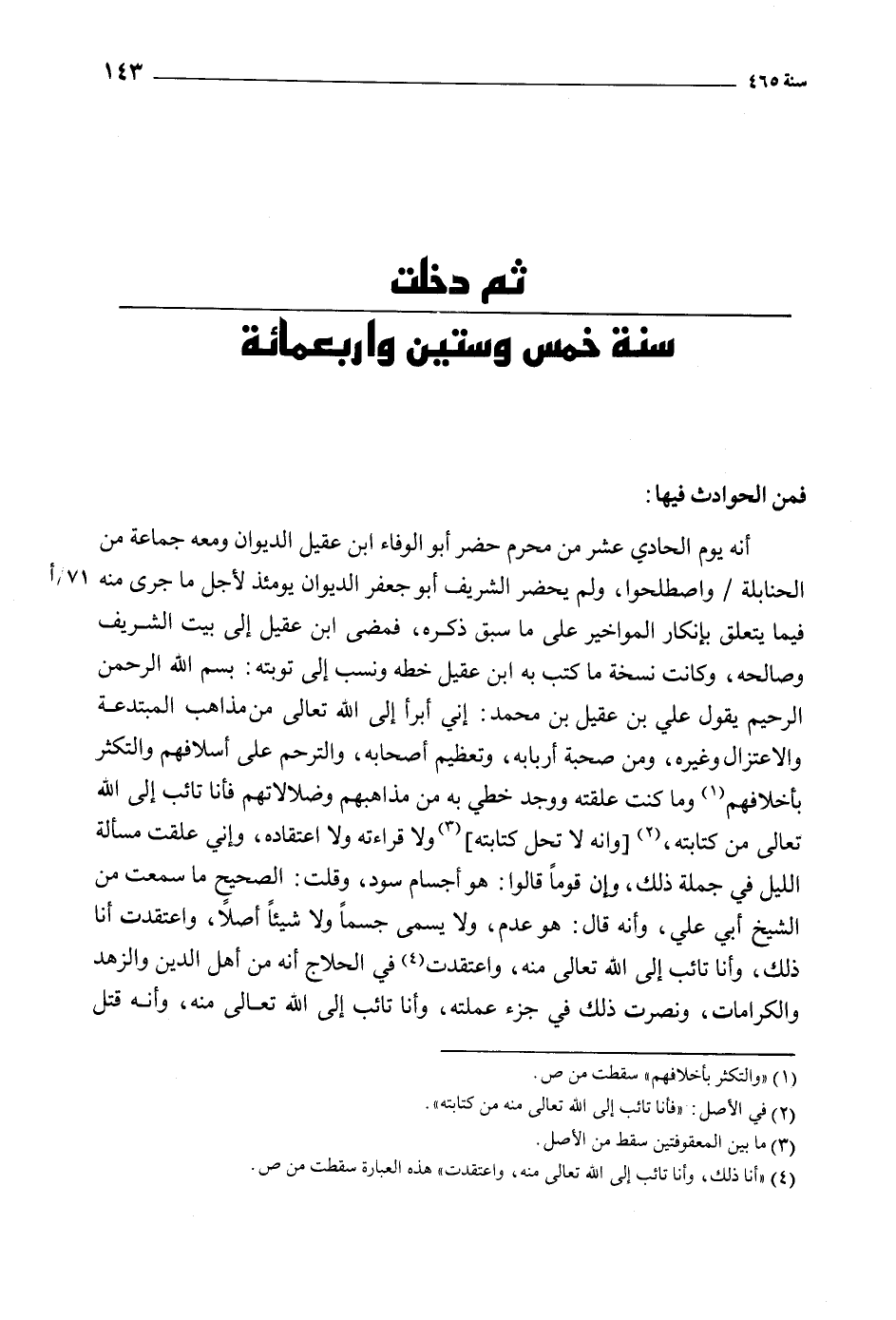 أنه يوم الحادي عشر من محرم حضر أبو الوفاء ابن عقيل الديوان ومعه جماعة من الحنابلة/ واصطلحوا، ولم يحضر الشريف أبو جعفر الديوان يومئذ لأجل ما جرى منه 71/ أفيما يتعلق بإنكار المواخير على ما سبق ذكره، فمضى ابن عقيل إلى بيت الشريف وصالحه، وكانت نسخة ما كتب به ابن عقيل خطه ونسب إلى توبته: بسم الله الرحمن الرحيم يقول على بن عقيل بن محمد: إني ابرأ إلى الله تعالى من مذاهب المبتدعة والاعتزال وغيره، ومن صحبة أربابه، وتعظيم أصحابه، والترحم على أسلافهم والتكثر بأخلافهم [1] وما كنت علقته ووجد خطى به من مذاهبهم وضلالاتهم فأنا تائب إلى الله تعالى من كتابته، [2] [وأنه لا تحل كتابته] [3] ولا قراءته ولا اعتقاده، وأني علقت مسألة الليل في جملة ذلك، وأن قوما قالوا: هو أجسام سود، وقلت: الصحيح ما سمعت من الشيخ أبي علي، وأنه قَالَ: هو عدم، ولا يسمى جسما ولا شيئا أصلا، واعتقدت أنا ذلك، وأنا تائب إلى الله تعالى منه، واعتقدت [4] في الحلاج أنه من أهل الدين والزهد والكرامات، ونصرت ذلك في جزء عملته، وأنا تائب إلى الله تعالى منه، وأنه قتل
