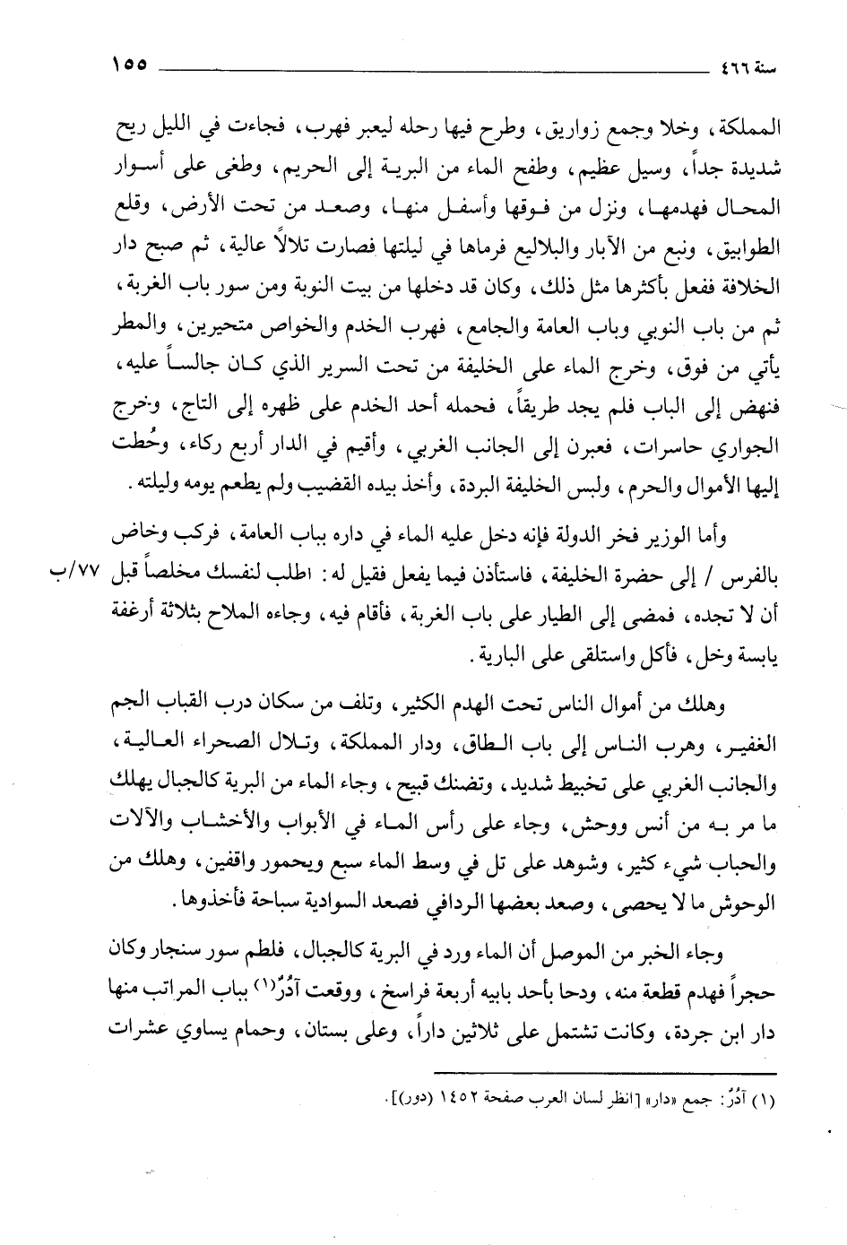وجاء الخبر من الموصل أن الماء ورد في البرية كالجبال، فلطم سور سنجار وكان حجرا فهدم قطعة منه، ودحا بأحد بابيه أربعة فراسخ، ووقعت آدر [1] بباب المراتب منها دار ابن جردة، وكانت تشتمل على ثلاثين دارا، وعلى بستان، وحمام يساوي عشرات