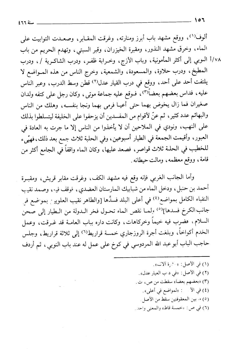 وأما الجانب الغربي فإنه وقع فيه مشهد الكف، وغرقت مقابر قريش، ومقبرة أحمد بن حنبل، ودخل الماء من شبابيك المارستان العضدي، فوقف فيه، وصمد نقيب النقباء الكامل بمواضع [4] في أعلى البلد فسدها [والطاهر نقيب العلويين بمواضع في جانب الكرخ فسدها] [5] ولما نقص الماء تحول فخر الدولة من الطيار إلى صحن السلام، فضرب فيه خيما وخركاهات، وكانت داره بباب العامة قد غرقت، وعمل الخدم أكواخا، وبلغت أجرة الروزجاري خمسة قراريط [6] إلى ثلاثة قراريط، وجلس حاجب الباب أبو عبد الله المردوسي في كوخ على عمل له عند باب النوبي، ثم أردف