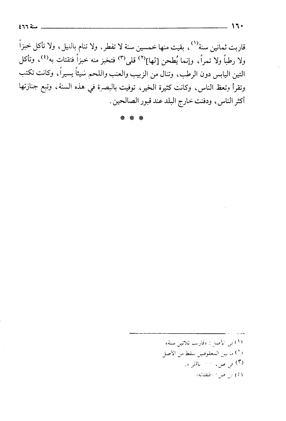 قاربت ثمانين سنة [1] ، بقيت منها خمسين سنة لا تفطر، ولا تنام بالليل، ولا تأكل خبزا ولا رطبا ولا تمرا، وإنما يطحن [لها] [2] قلى [3] فتخبز منه خبزا فتقتات به [4] ، وتأكل التين اليابس دون الرطب، وتنال من الزبيب والعنب واللحم شيئا يسيرا، وكانت تكتب وتقرأ وتعظ الناس، وكانت كثيرة الخير، توفيت بالبصرة في هذه السنة، وتبع جنازتها أكثر الناس، ودفنت خارج البلد عند قبور الصالحين.