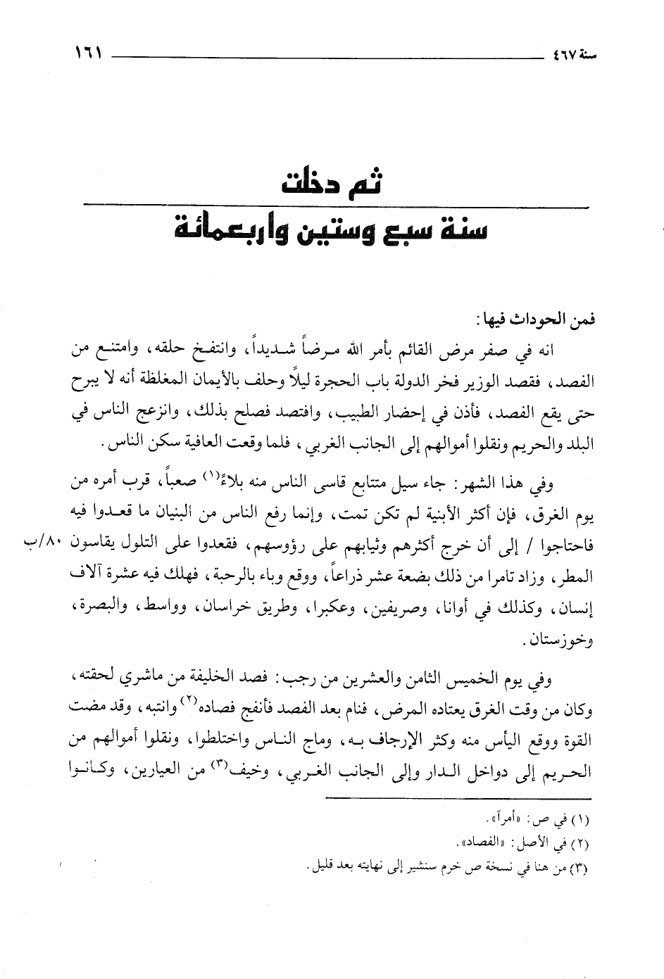 أنه في صفر مرض القائم بأمر الله مرضا شديدا، وانتفخ حلقه، وامتنع من الفصد، فقصد الوزير فخر الدولة باب الحجرة ليلا وحلف بالأيمان المغلظة أنه لا يبرح حتى يقع الفصد، فأذن في إحضار الطبيب، وافتصد فصلح بذلك، وانزعج الناس في البلد والحريم ونقلوا أموالهم إلى الجانب الغربي، فلما وقعت العافية سكن الناس.
