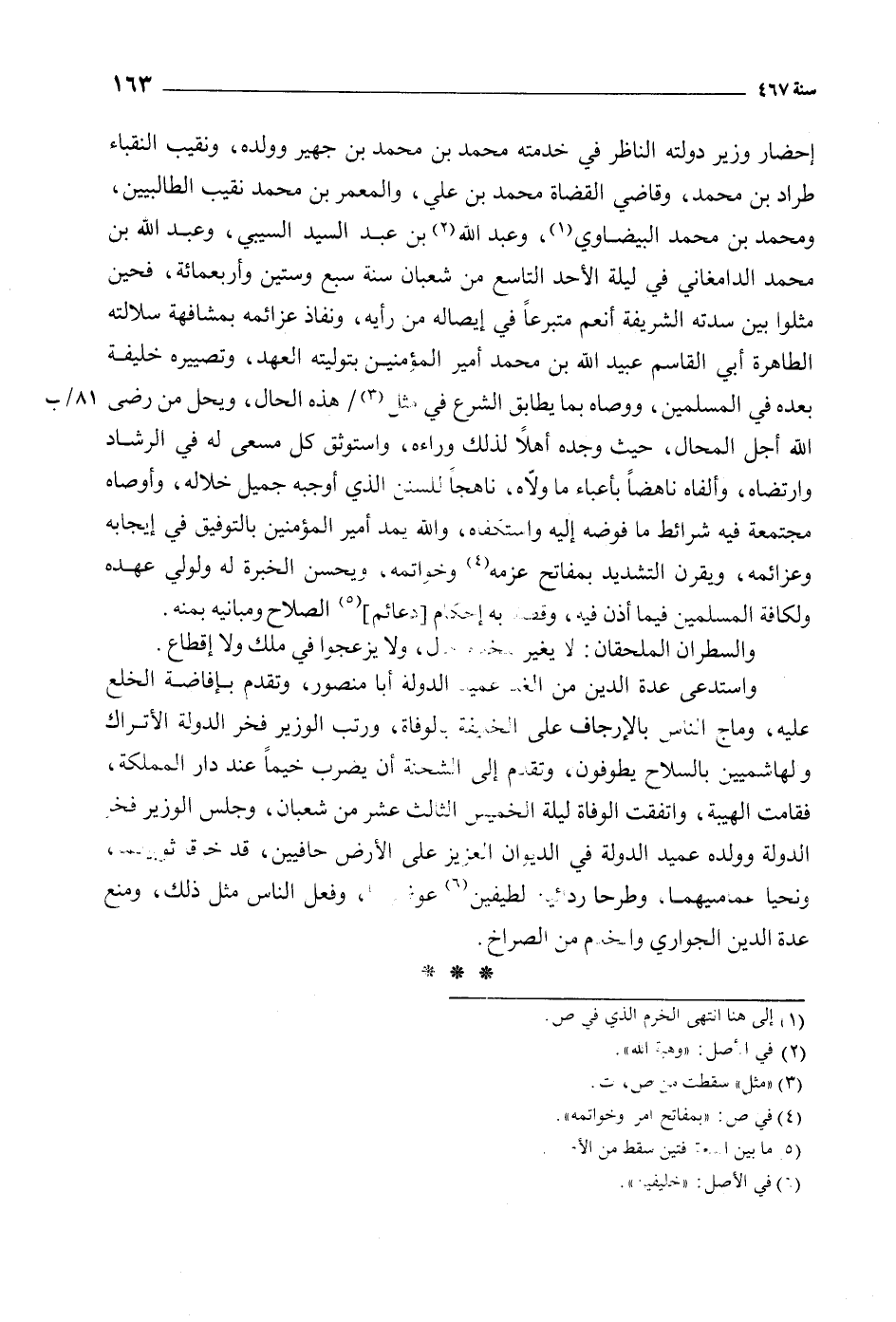 إحضار وزير دولته الناظر في خدمته محمد بن محمد بن جهير وولده، ونقيب النقباء طراد بن محمد، وقاضى القضاة محمد بن علي، والمعمر بن محمد نقيب الطالبيين، ومحمد بن محمد البيضاوي [1] ، وعبد الله [2] بن عبد السيد السيبي، وعبد الله بن محمد الدامغاني في ليلة الأحد التاسع من شعبان سنة سبع وستين وأربعمائة، فحين مثلوا بين سدته الشريفة أنعم متبرعا في إيصاله من رأيه، ونفاذ عزائمه بمشافهة سلالته الطاهرة أبي القاسم عبيد الله بن محمد أمير المؤمنين بتوليته العهد، وتصييره خليفة بعده في المسلمين، ووصاه بما يطابق الشرع في مثل [3] / هذه الحال، ويحل من رضى 81/ ب الله أجل المحال، حيث وجده أهلا لذلك وراءه، واستوثق كل مسعى له في الرشاد وارتضاه، وألفاه ناهضا بأعباء ما ولاه، ناهجا للسنن الذي أوجبه جميل خلاله، وأوصاه مجتمعة فيه شرائط ما فوضه إليه واستكفاه، والله يمد أمير المؤمنين بالتوفيق في إيجابه وعزائمه، ويقرن التشديد بمفاتح عزمه [4] وخواتمه، ويحسن الخبرة له ولولي عهده ولكافة المسلمين فيما أذن فيه، وقصد به أحكام [دعائم] [5] الصلاح ومبانيه بمنه.