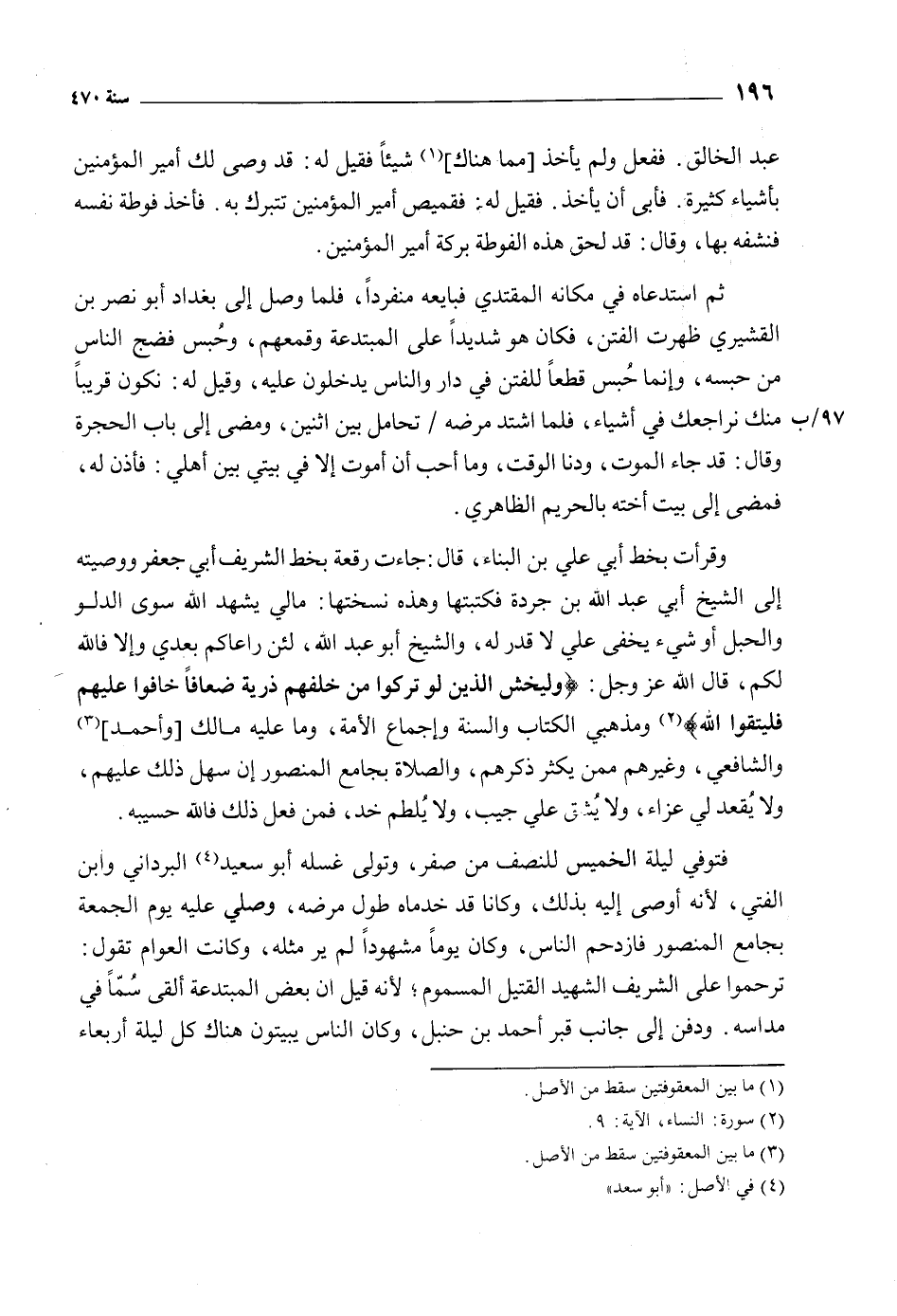 وقرأت بخط أبي على بن البناء، قَالَ: جاءت رقعة بخط الشريف أبي جعفر ووصيته إلى الشيخ أبي عبد الله بن جردة فكتبتها وهذه نسختها: ما لي يشهد الله سوى الدلو والحبل أو شيء يخفي على لا قدر له، والشيخ أبو عبد الله، لئن راعاكم بعدي وإلا فاللَّه لكم، قَالَ الله عز وجل: وَلْيَخْشَ الَّذِينَ لَوْ تَرَكُوا مِنْ خَلْفِهِمْ ذُرِّيَّةً ضِعافاً خافُوا عَلَيْهِمْ فَلْيَتَّقُوا الله 4: 9 [2] ومذهبي الكتاب والسنة وإجماع الأمة، وما عليه مالك [وأحمد] [3] والشافعي، وغيرهم ممن يكثر ذكرهم، والصلاة بجامع المنصور إن سهل ذلك عليهم، ولا يقعد لي عزاء، ولا يشق على جيب، ولا يلطم خد، فمن فعل ذلك فاللَّه حسيبه.
