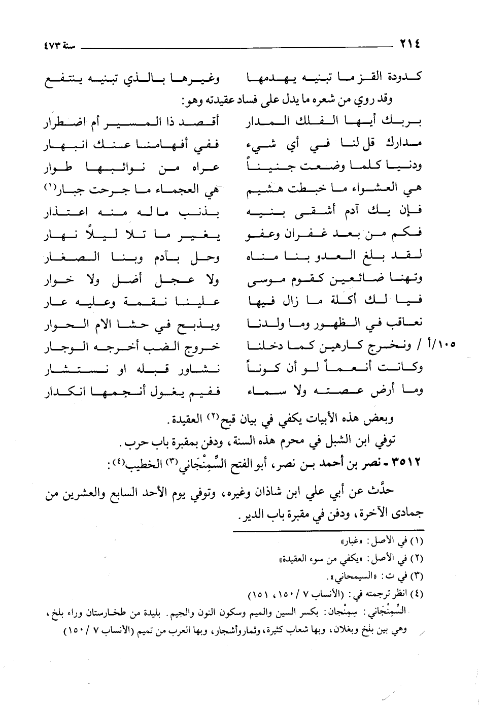 [4] انظر ترجمته في: (الأنساب 7/ 150، 151) السّمنجاني: سمنجان: بكسر السين والميم وسكون النون والجيم. بليدة من طخارستان وراء بلخ، وهي بين بلخ وبغلان، وبها شعاب كثيرة، وثمار وأشجار، وبها العرب من تميم (الأنساب 7/ 150)