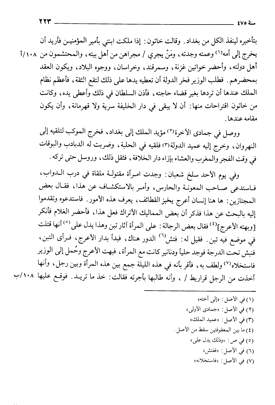 وفي يوم الأحد سلخ شعبان: وجدت امرأة مقتولة ملقاة في درب الدواب، فاستدعى صاحب المعونة والحارس، وأمر بالاستكشاف عن هذا، فقال بعض المجتازين: هاهنا إنسان أعرج يخبز القطائف، يعرف هذه الأمور. فاستدعوه وتقدموا إليه بالبحث عن هذا فذكر أن بعض المماليك الأتراك فعل هذا، فاحضر الغلام فأنكر [وبهته الأعرج] [4] فقال بعض الرجالة: على المرأة آثار تبن وهذا يدل على [5] أنها قتلت في موضع فيه تبن. فقيل له: فتش [6] الدور هناك، فبدأ بدار الأعرج، فرأى التبن، فنبش تحت الدرجة فوجد حليا ودنانير كانت مع المرأة، فبهت الأعرج وحمل إلى الوزير فاستخلاه [7] ولطف به، فأقر بأنه في هذه الليلة جمع بين هذه المرأة وبين رجل، وأنها أخذت من الرجل قراريط/، وأنه طالبها بأجرته فقالت: خذ ما تريد. فوقع عليها 108/ ب