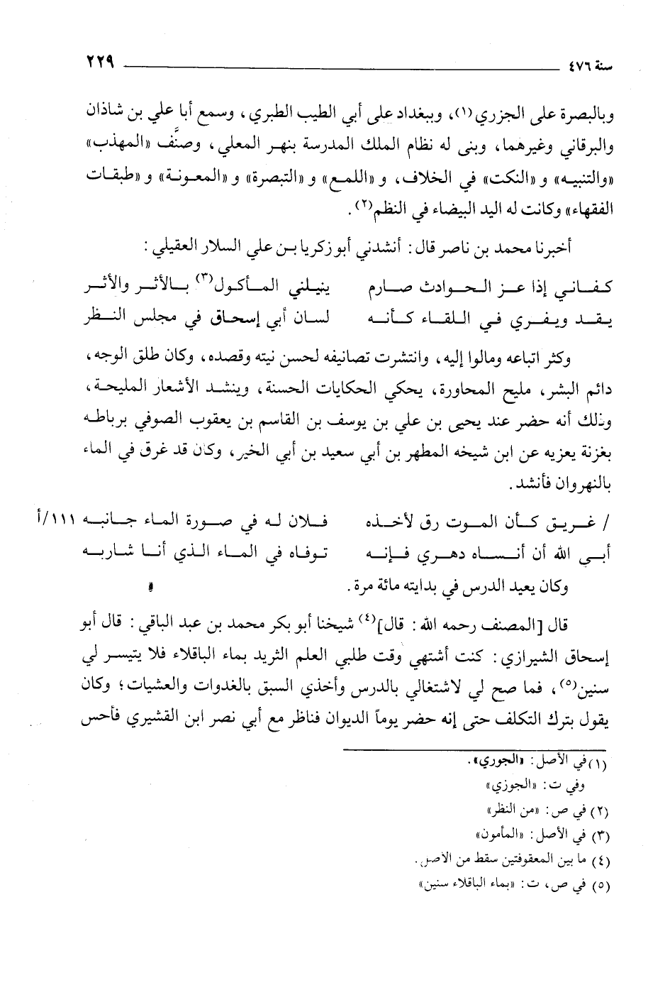 وبالبصرة على الجزري [1] ، وببغداد على أبي الطيب الطبري، وسمع أبا علي بن شاذان والبرقاني وغيرهما، وبنى له نظام الملك المدرسة بنهر المعلى، وصنّف «المهذب» «والتنبيه» و «النكت» في الخلاف، و «اللمع» و «التبصرة» و «المعونة» و «طبقات الفقهاء» وكانت له اليد البيضاء في النظم [2] .