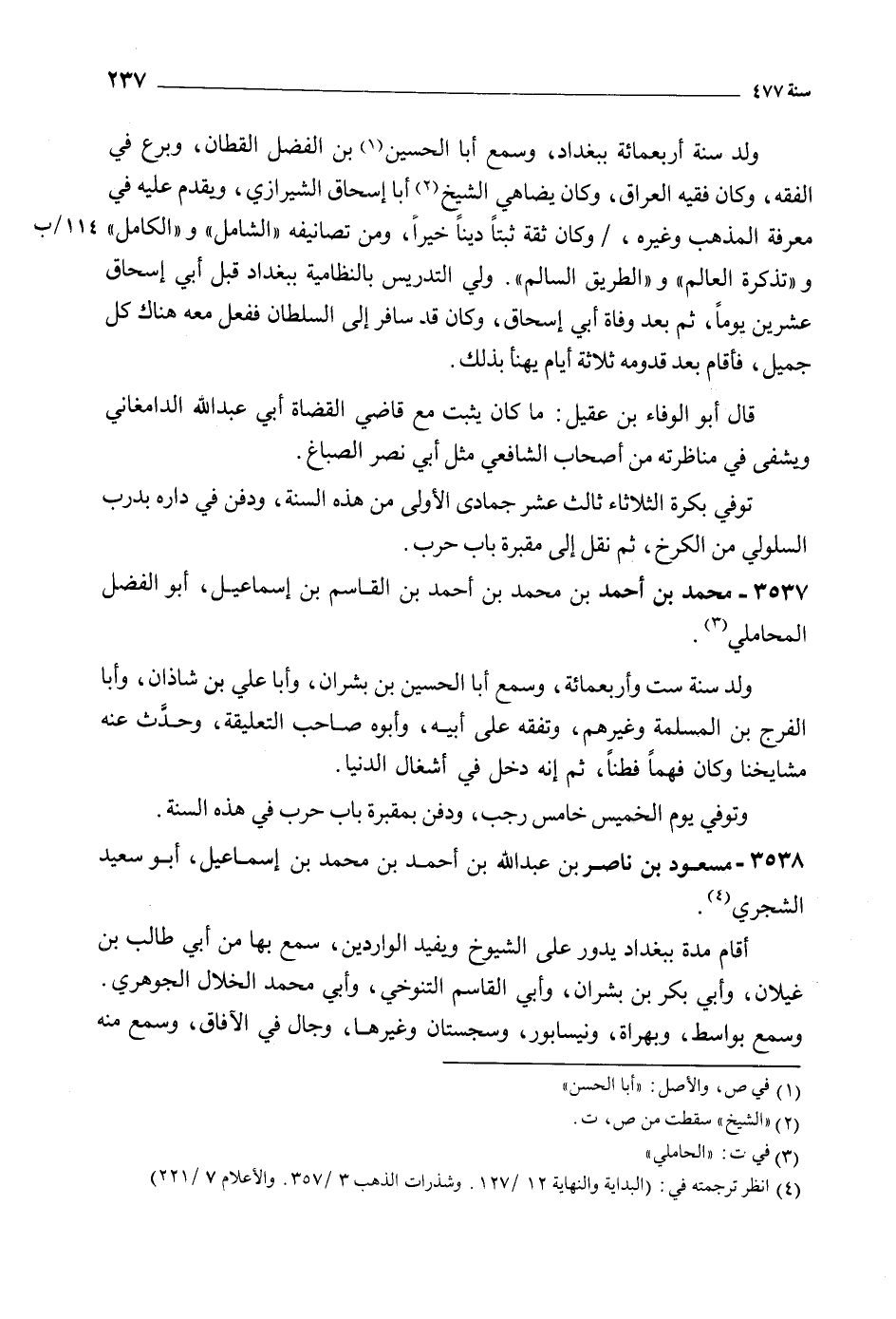 ولد سنة أربعمائة ببغداد، وسمع أبا الحسين [1] بن الفضل القطان، وبرع في الفقه، وكان فقيه العراق، وكان يضاهي الشيخ [2] أبا إسحاق الشيرازي، ويقدم عليه في معرفة المذهب وغيره، / وكان ثقة ثبتا دينا خيرا، ومن تصانيفه «الشامل» و «الكامل» 114/ ب و «تذكرة العالم» و «الطريق السالم» . ولي التدريس بالنظامية ببغداد قبل أبي إسحاق عشرين يوما، ثم بعد وفاة أبي إسحاق، وكان قد سافر إلى السلطان ففعل معه هناك كل جميل، فأقام بعد قدومه ثلاثة أيام يهنأ بذلك.