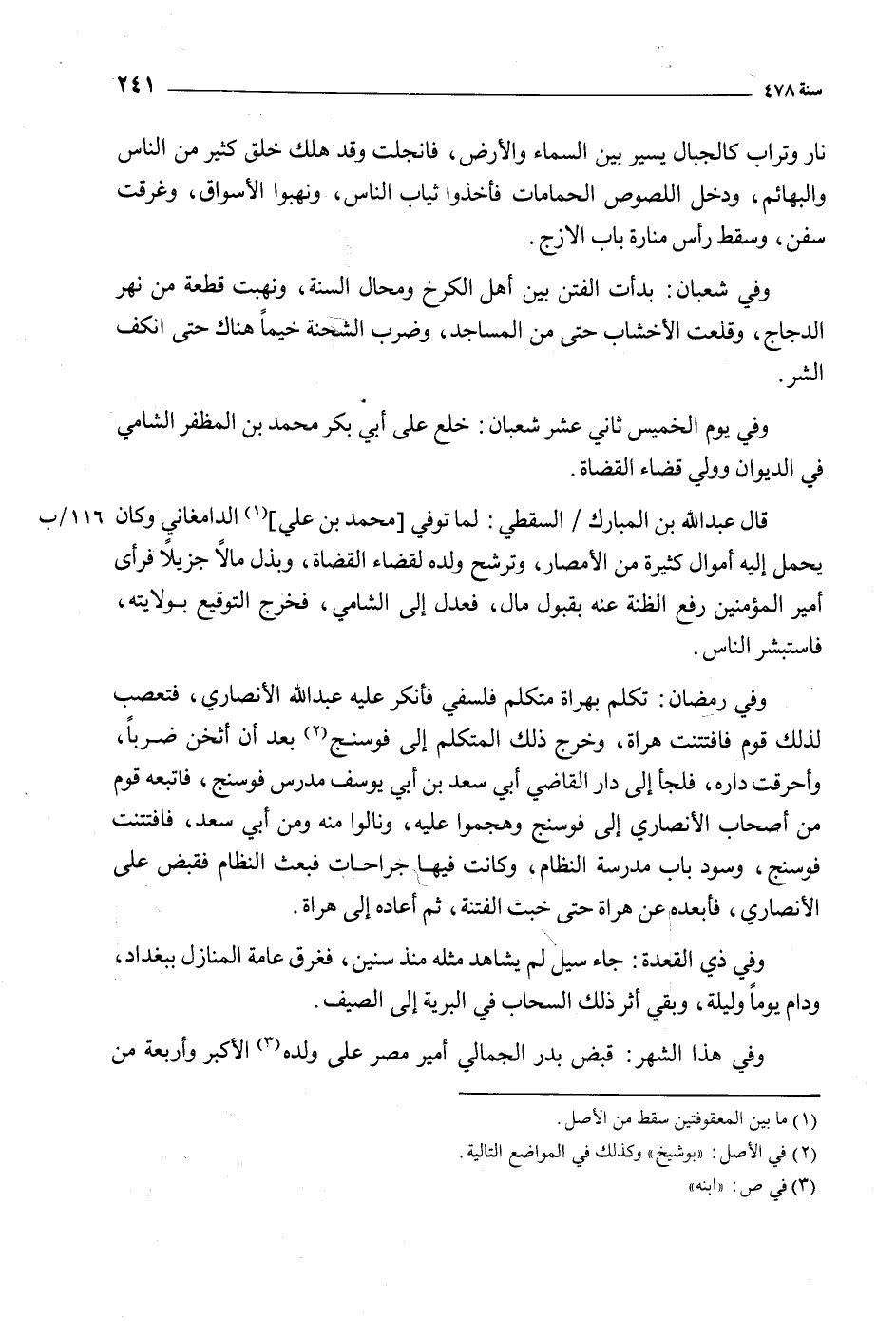 وفي شعبان: بدأت الفتن بين أهل الكرخ ومحال السنة، ونهبت قطعة من نهر الدجاج، وقلعت الأخشاب حتى من المساجد، وضرب الشحنة خيما هناك حتى انكف الشر.