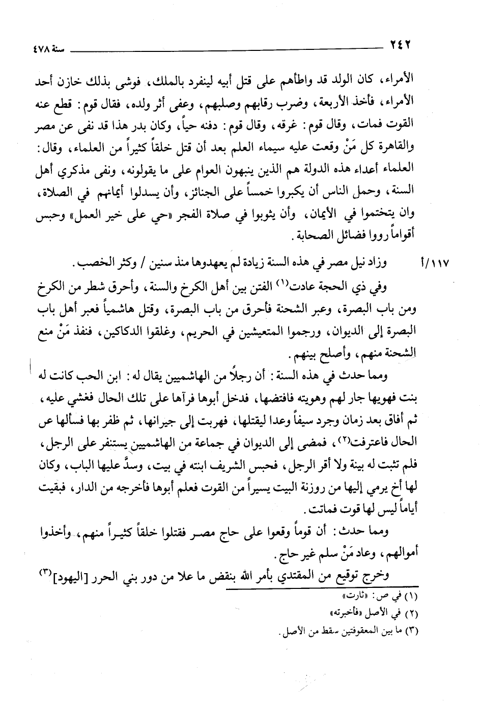 ومما حدث: أن قوما وقعوا على حاج مصر فقتلوا خلقا كثيرا منهم، وأخذوا أموالهم، وعاد من سلم غير حاج، وخرج توقيع من المقتدى بأمر الله بنقض ما علا من دور بني الحرر [اليهود] [3]
