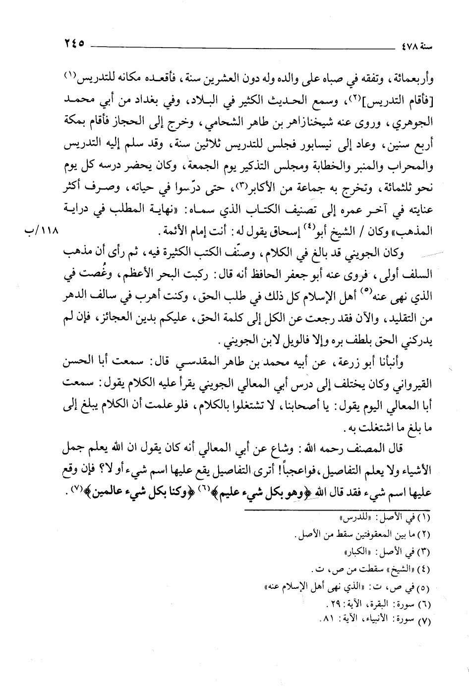 قَالَ المصنف رحمه الله: وشاع عن أبي المعالي أنه كان يقول إن الله يعلم جمل الأشياء ولا يعلم التفاصيل، فوا عجبا! أترى التفاصيل يقع عليها اسم شيء أو لا؟ فإن وقع عليها اسم شيء فقد قال الله وَهُوَ بِكُلِّ شَيْءٍ عَلِيمٌ 2: 29 [6] وَكُنَّا بِكُلِّ شَيْءٍ عالِمِينَ 21: 81 [7] .