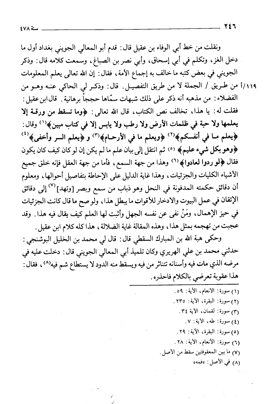 ونقلت من خط أبى الوفاء بن عقيل قَالَ: قدم أبو المعالي الجويني بغداد أول ما دخل الغز، وتكلم في أبي إسحاق، وأبي نصر بن الصباغ، وسمعت كلامه قَالَ: وذكر الجويني في بعض كتبه ما خالف به إجماع الأمة، فقال: إن الله تعالى يعلم المعلومات 119/ أمن طريق الجملة لا من طريق التفصيل. قَالَ: وذكر لي الحاكي عنه وهو من الفضلاء: من مذهبه أنه ذكر على ذلك شبهات سماها حججا برهانية. قَالَ ابن عقيل: