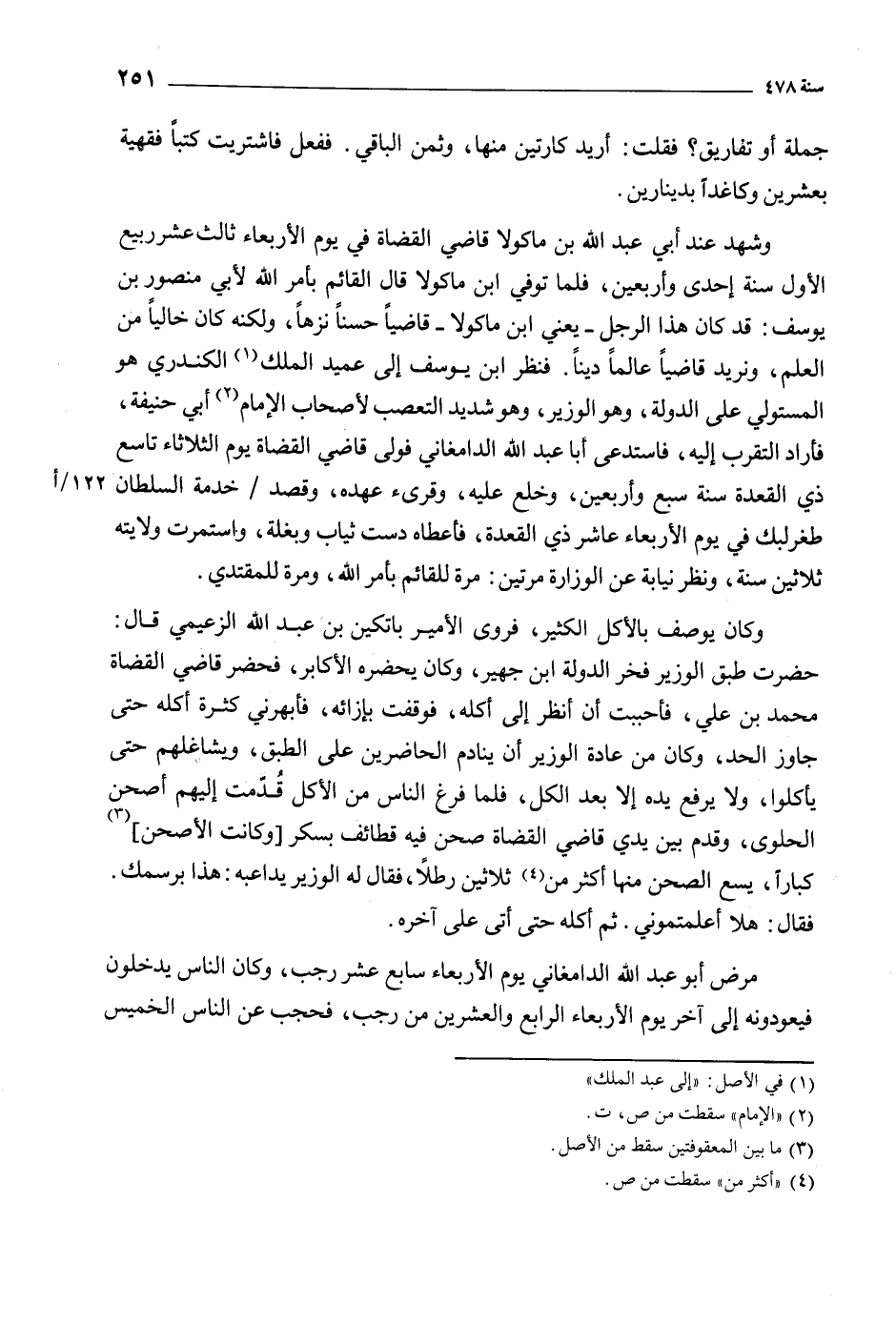 حضرت طبق الوزير فخر الدولة ابن جهير، وكان يحضره الأكابر، فحضر قاضي القضاة محمد بن على، فأحببت أن أنظر إلى أكله، فوقفت بإزائه، فأبهرني كثرة أكله حتى جاوز الحد، وكان من عادة الوزير أن ينادم الحاضرين على الطبق، ويشاغلهم حتى يأكلوا، ولا يرفع يده إلا بعد الكل، فلما فرغ الناس من الأكل قدمت إليهم أصحن الحلوى، وقدم بين يدي قاضي القضاة صحن فيه قطائف بسكر [وكانت الأصحن] [3] كبارا، يسع الصحن منها أكثر من [4] ثلاثين رطلا، فقال له الوزير يداعبه: هذا برسمك.