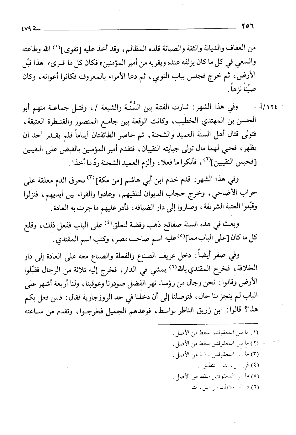 24/ أوفي هذا الشهر: ثارت الفتنة بين السنة والشيعة/، وقتل جماعة منهم أبو الحسن بن المهتدي الخطيب، وكانت الوقعة بين جامع المنصور والقنطرة العتيقة، فتولى قتال أهل السنة العميد والشحنة، ثم حاصر الطائفتان أياما فلم يقدر أحد أن يظهر، فجبي لهما مال تولى جبايته النقيبان، فتقدم أمير المؤمنين بالقبض على النقيبين [فحبس النقيبين] [2] ، فأنكرا ما فعلا، وألزم العميد الشحنة رد ما أخذا.