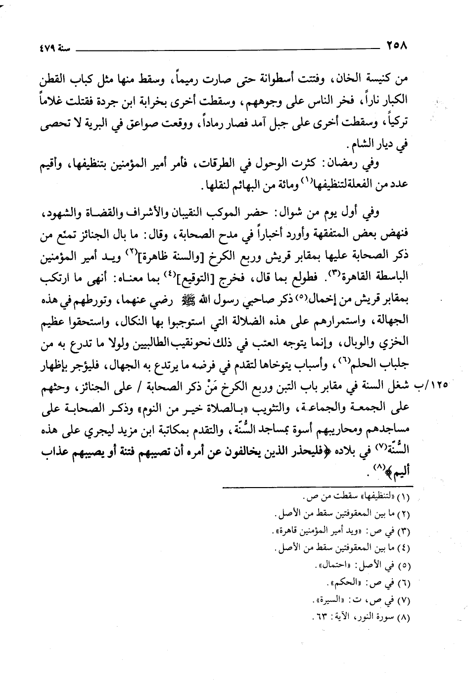 وفي أول يوم من شوال: حضر الموكب النقيبان والأشراف والقضاة والشهود، فنهض بعض المتفقهة وأورد أخبارا في مدح الصحابة، وقال: ما بال الجنائز تمنع من ذكر الصحابة عليها بمقابر قريش وربع الكرخ [والسنة ظاهرة] [2] ويد أمير المؤمنين الباسطة القاهرة [3] . فطولع بما قَالَ، فخرج [التوقيع] [4] بما معناه: أنهى ما ارتكب بمقابر قريش من إخمال [5] ذكر صاحبي رسول الله صلى الله عليه وسلم رضي عنهما، وتورطهم في هذه الجهالة، واستمرارهم على هذه الضلالة التي استوجبوا بها النكال، واستحقوا العظيم الخزي والوبال، وإنما يتوجه العتب في ذلك نحو نقيب الطالبيين ولولا ما تدرع به من جلباب الحلم [6] ، وأسباب يتوخاها لتقدم في فرضه ما يرتدع به الجهال، فليؤجر بإظهار 125/ ب شغل السنة في مقابر باب التبن وربع الكرخ من ذكر الصحابة/ على الجنائز، وحثهم على الجمعة والجماعة، والتثويب «بالصلاة خير من النوم» وذكر الصحابة على مساجدهم ومحاريبهم أسوة بمساجد السنة، والتقدم بمكاتبة ابن مزيد ليجري على هذه السّنّة [7] في بلاده فَلْيَحْذَرِ الَّذِينَ يُخالِفُونَ عَنْ أَمْرِهِ أَنْ تُصِيبَهُمْ فِتْنَةٌ أَوْ يُصِيبَهُمْ عَذابٌ أَلِيمٌ 24: 63 [8] .
