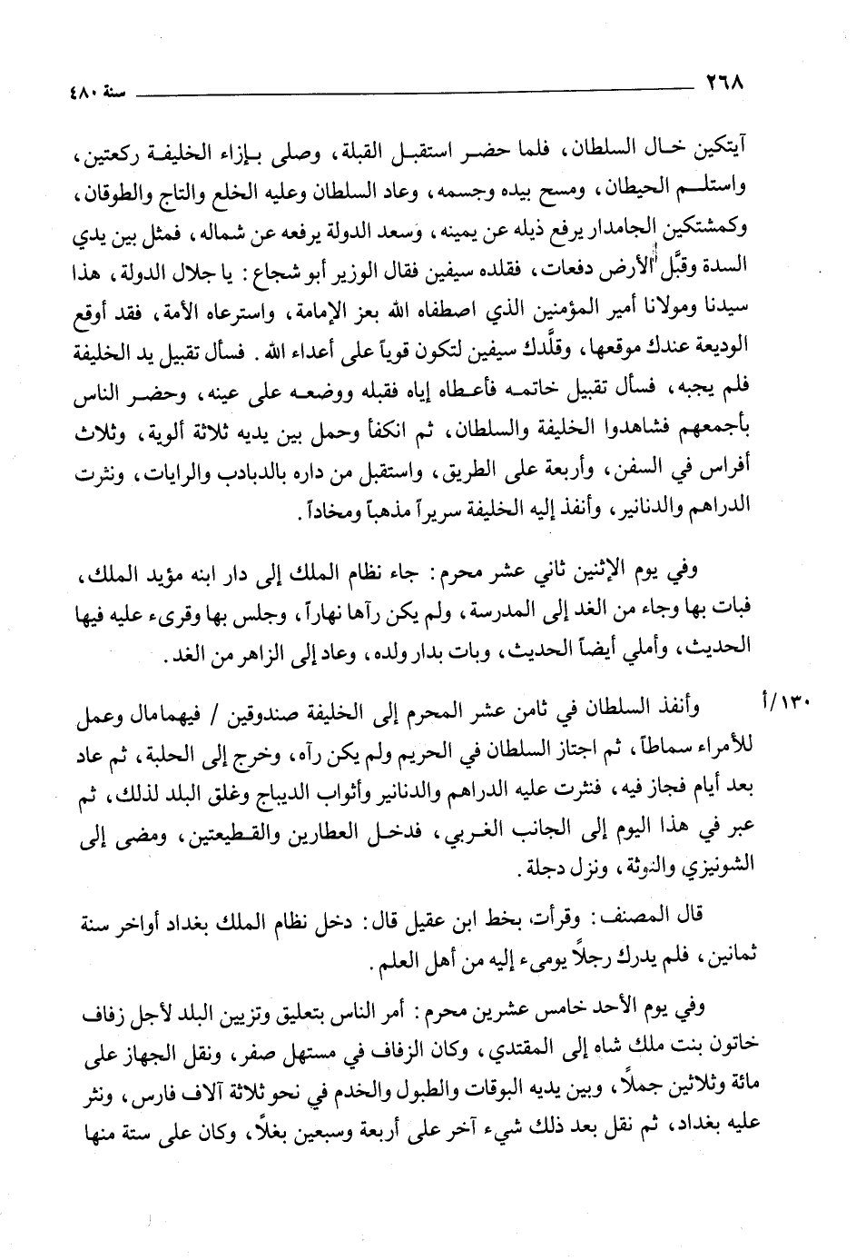 130/ أوأنفذ السلطان في ثامن عشر المحرم إلى الخليفة صندوقين/ فيهما مال وعمل للأمراء سماطا، ثم اجتاز السلطان في الحريم ولم يكن رآه، وخرج إلى الحلبة، ثم عاد بعد أيام فجاز فيه، فنثرت عليه الدراهم والدنانير وأثواب الديباج وغلق البلد لذلك، ثم عبر في هذا اليوم إلى الجانب الغربي، فدخل العطارين والقطيعتين، ومضي إلى الشونيزي والتوثة، ونزل دجلة.