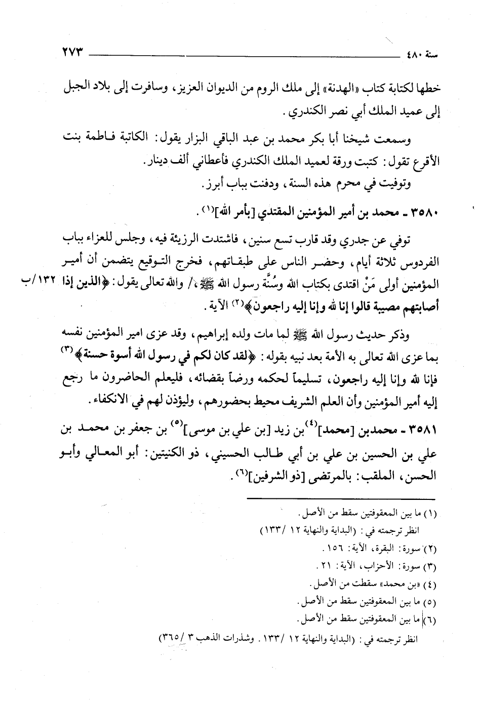 وذكر حَدِيث رَسُول اللَّه صَلَّى اللَّهُ عَلَيْهِ وَسَلَّمَ لما مات ولده إبراهيم، وقد عزى أمير المؤمنين نفسه بما عزى الله تعالى به الأمة بعد نبيه بقوله: لَقَدْ كانَ لَكُمْ فِي رَسُولِ اللَّهِ أُسْوَةٌ حَسَنَةٌ 33: 21 [3] فإنا للَّه وإنا إليه راجعون، تسليما لحكمه ورضا بقضائه، فليعلم الحاضرون ما رجع إليه أمير المؤمنين وأن العلم الشريف محيط بحضورهم، وليؤذن لهم في الانكفاء.