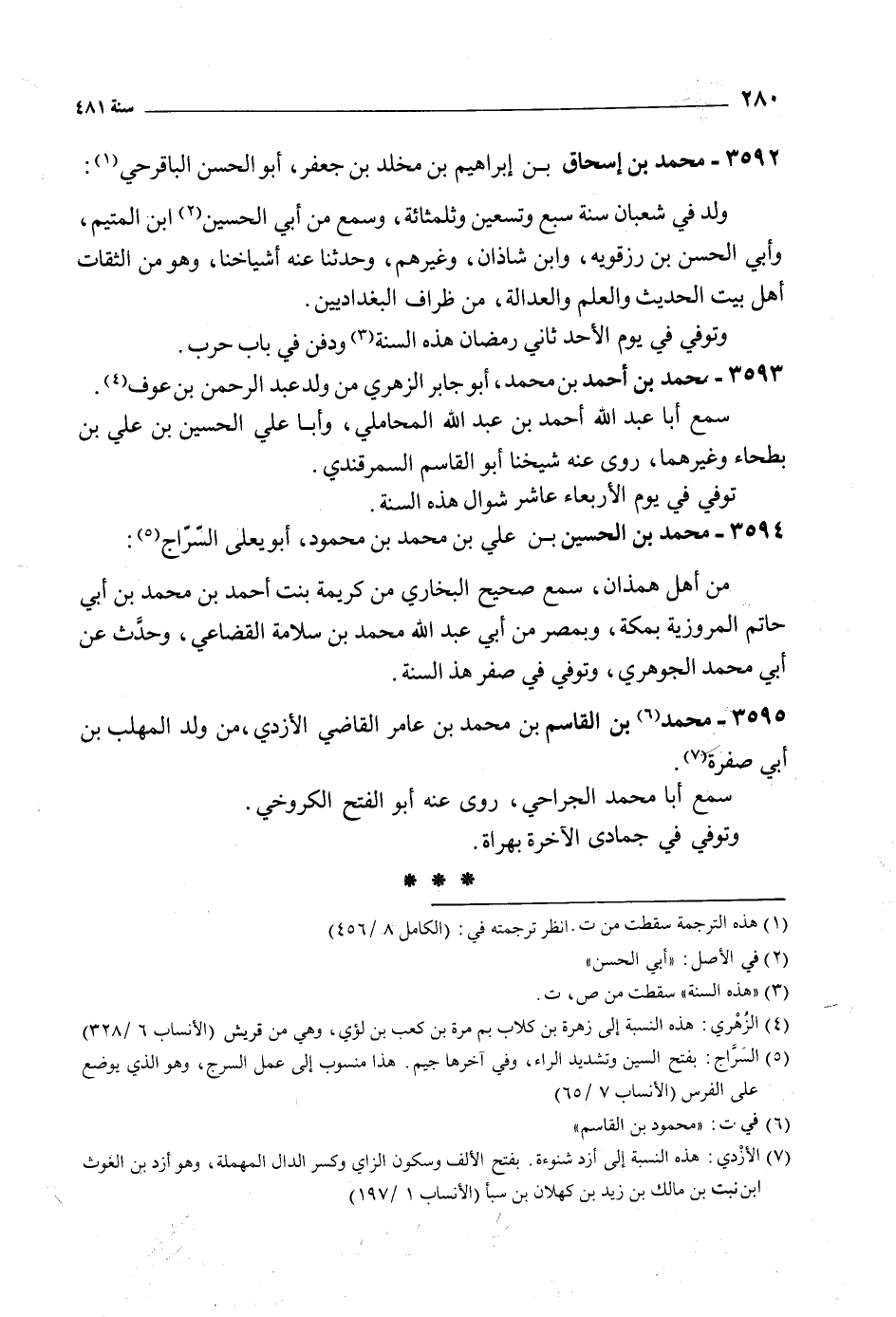 [5] السرّاج: بفتح السين وتشديد الراء، وفي آخرها جيم. هذا منسوب إلى علم السرج، وهو الّذي يوضع على الفرس (الأنساب 7/ 65)
