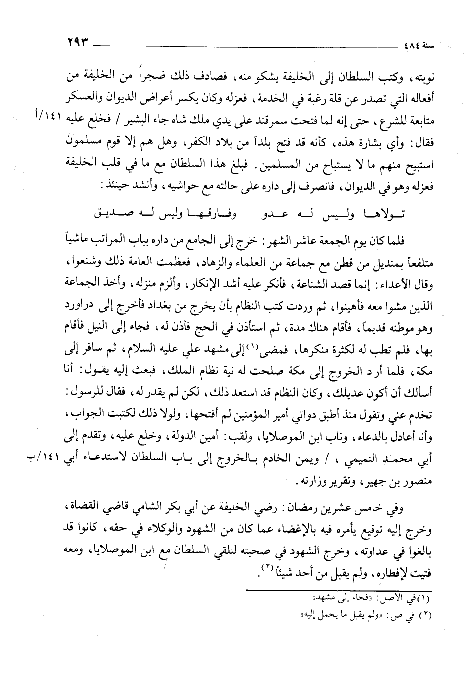 نوبته، وكتب السلطان إلى الخليفة يشكو منه، فصادف ذلك ضجرا من الخليفة من أفعاله التي تصدر عن قلة رغبة في الخدمة، فعزله وكان يكسر أعراض الديوان والعسكر متابعة للشرع، حتى إنه لما فتحت سمرقند على يدي ملك شاه جاء البشير/ فخلع عليه 141/ أفقال: وأي بشارة هذه، كأنه قد فتح بلدا من بلاد الكفر، وهل هم إلا قوم مسلمون استبيح منهم ما لا يستباح من المسلمين. فبلغ هذا السلطان مع ما في قلب الخليفة فعزله وهو في الديوان، فانصرف إلى داره على حالته مع حواشيه، وأنشد حينئذ: