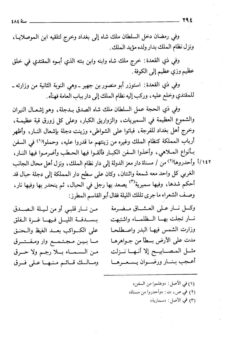 وفي ذي الحجة عمل السلطان ملك شاه الصدق بدجلة، وهو إشعال النيران والشموع العظيمة في السميريات، والزواريق الكبار، وعلى كل زورق قبة عظيمة، وخرج أهل بغداد للفرجة، فباتوا على الشواطئ وزينت دجلة بإشعال النار، وأظهر أرباب المملكة كنظام الملك وغيره من زينتهم ما قدروا عليه، وحملوا [1] في السفن بأنواع الملاهي، وأخذوا السفن الكبار فألقوا فيها الحطب وأضرموا فيها النار، 142/ أوأحدروها [2] من/ مسناة دار معز الدولة إلى دار نظام الملك، ونزل أهل محال الجانب الغربي كل واحد معه شمعة واثنتان، وكان على سطح دار المملكة إلى دجلة حبال قد أحكم شدها، وفيها سميرية [3] يصعد بها رجل في الحبال، ثم ينحدر بها وفيها نار، وصف الشعراء ما جرى تلك الليلة فقال أبو القاسم المطرز: