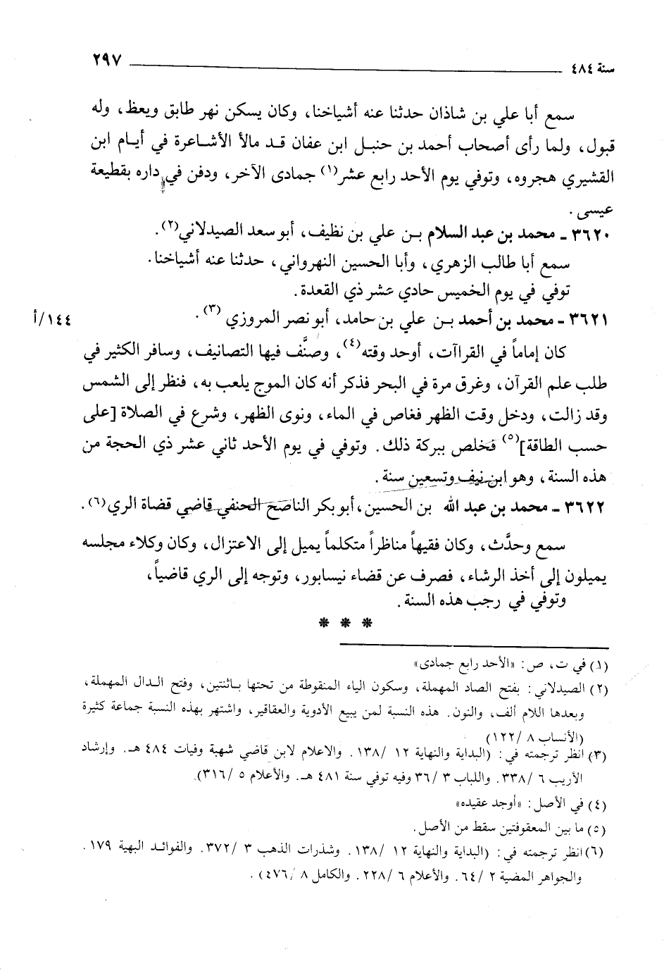 [3] انظر ترجمته في: (البداية والنهاية 12/ 138. والأعلام لابن قاضي شهبة وفيات 484 هـ. وإرشاد الأريب 6/ 338. واللباب 3/ 36 وفيه توفي سنة 481 هـ. والأعلام 5/ 316)
