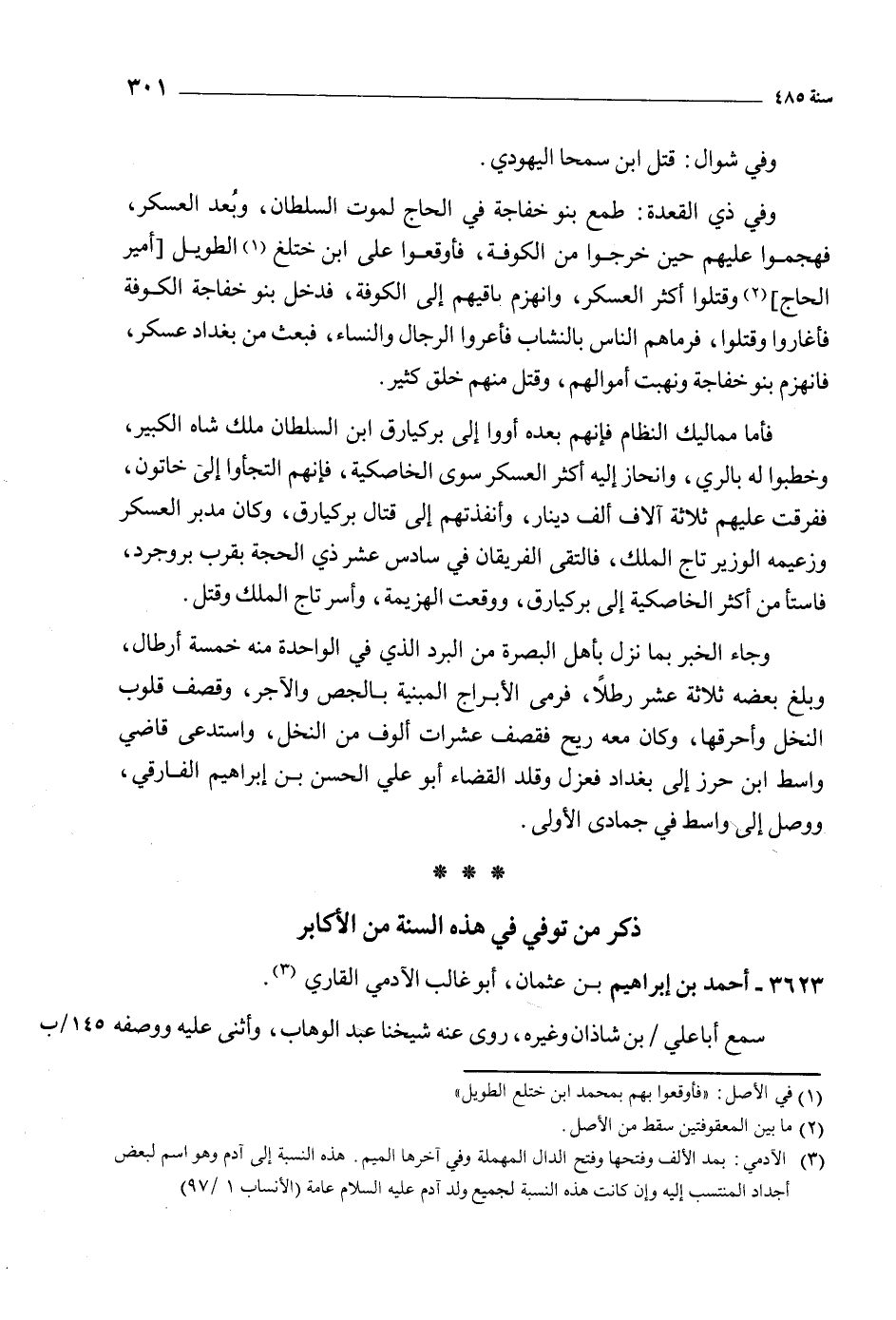 وفي ذي القعدة: طمع بنو خفاجة في الحاج لموت السلطان، وبعد العسكر، فهجموا عليهم حين خرجوا من الكوفة، فأوقعوا عَلَى ابن ختلغ [1] الطويل [أمير الحاج] [2] وقتلوا أكثر العسكر، وانهزم باقيهم إِلَى الكوفة، فدخل بنو خفاجة الكوفة فأغاروا وقتلوا، فرماهم الناس بالنشاب فأعروا الرجال والنساء، فبعث من بغداد عسكر، فانهزم بنو خفاجة ونهبت أموالهم، وقتل منهم خلق كثير.