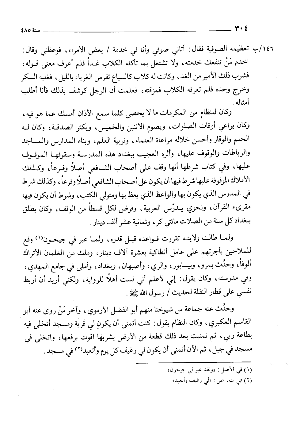 وحدث عنه جماعة من شيوخنا منهم أبو الفضل الأرموي، وآخر من روى عنه أبو القاسم العكبري، وكان النظام يقول: كنت أتمنى أن يكون لي قرية ومسجد أتخلى فيه بطاعة ربي، ثم تمنيت بعد ذلك قطعة من الأرض بشربها أقوت برفعها، وأتخلى في مسجد في جبل، ثم الآن أتمنى أن يكون لي رغيف كل يوم وأتعبد [2] في مسجد.