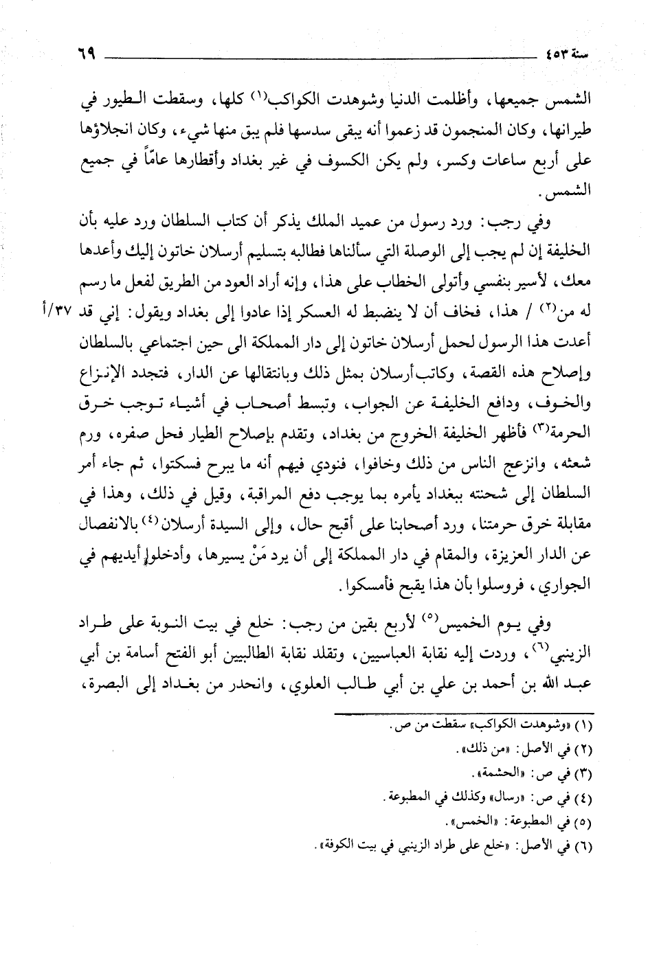 الشمس جميعها، وأظلمت الدنيا وشوهدت الكواكب [1] كلها، وسقطت الطيور في طيرانها، وكان المنجمون قد زعموا أنه يبقى سدسها فلم يبق منها شيء، وكان انجلاؤها على أربع ساعات وكسر، ولم يكن الكسوف في غير بغداد وأقطارها عاما في جميع الشمس.