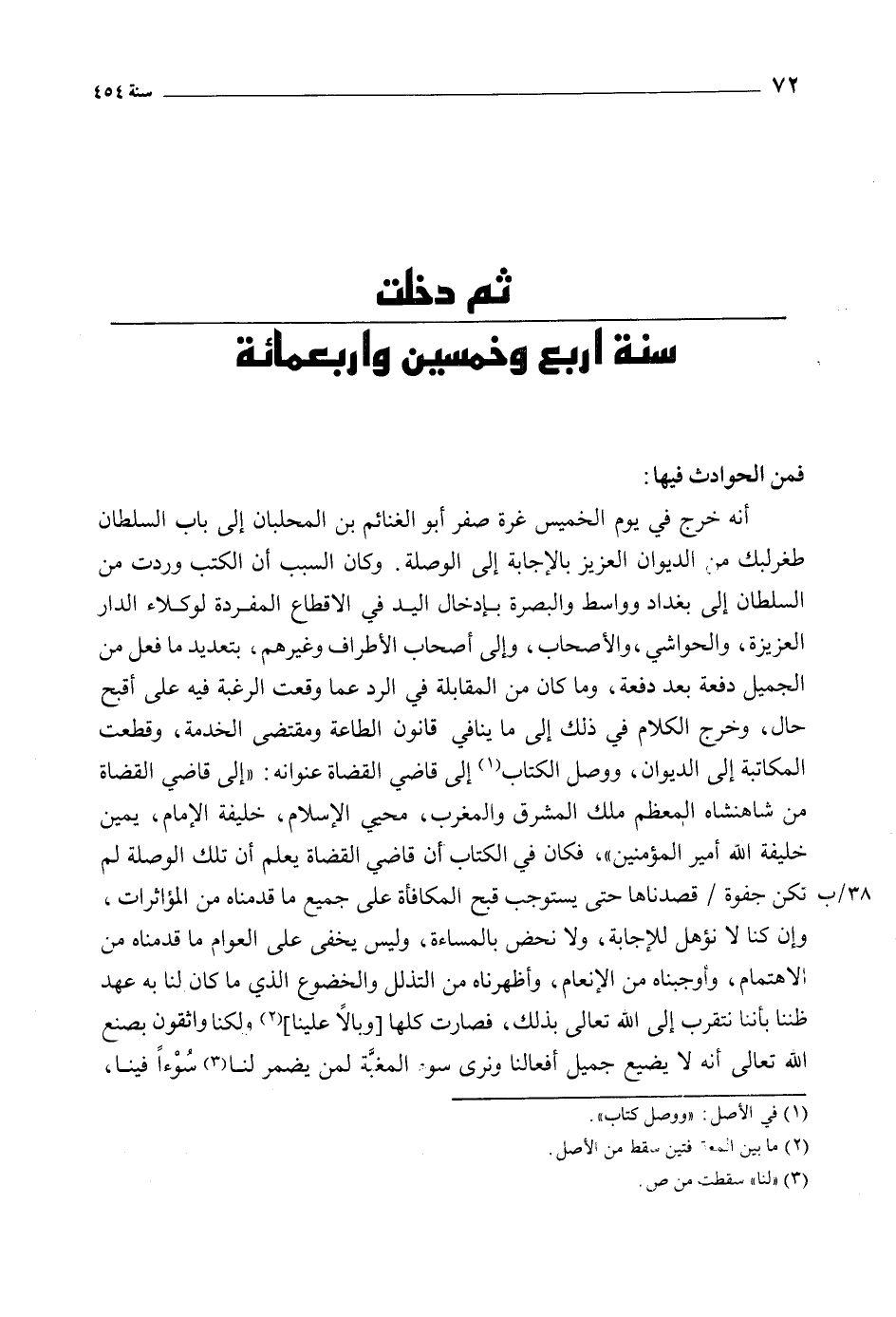 أنه خرج في يوم الخميس غرة صفر أبو الغنائم بن المحلبان إلى باب السلطان طغرلبك من الديوان العزيز بالإجابة إلى الوصلة. وكان السبب أن الكتب وردت من السلطان إلى بغداد وواسط والبصرة بإدخال اليد في الإقطاع المفردة لوكلاء الدار العزيزة، والحواشي، والأصحاب، وإلى أصحاب الأطراف وغيرهم، بتعديد ما فعل من الجميل دفعة بعد دفعة، وما كان من المقابلة في الرد عما وقعت الرغبة فيه على أقبح حال، وخرج الكلام في ذلك إلى ما ينافى قانون الطاعة ومقتضى الخدمة، وقطعت المكاتبة إلى الديوان، ووصل الكتاب [1] إلى قاضي القضاة عنوانه: «إلى قاضي القضاة من شاهنشاه المعظم ملك المشرق والمغرب، محيي الإسلام، خليفة الإمام، يمين خليفة الله أمير المؤمنين» ، فكان في الكتاب أن قاضي القضاة يعلم أن تلك الوصلة لم 38/ ب تكن جفوة/ قصدناها حتى يستوجب قبح المكافأة على جميع ما قدمناه من المؤاثرات، وإن كنا لا نؤهل للإجابة، ولا نحض بالمساءة، وليس يخفي على العوام ما قدمناه من الاهتمام، وأوجبناه من الإنعام، وأظهرناه من التذلل والخضوع الذي ما كان لنا به عهد ظننا بأننا نتقرب إلى الله تعالى بذلك، فصارت كلها [وبالا علينا] [2] ولكنا واثقون بصنع الله تعالى أنه لا يضيع جميل أفعالنا ونرى سوء المغبّة لمن يضمر لنا [3] سوءا فينا،