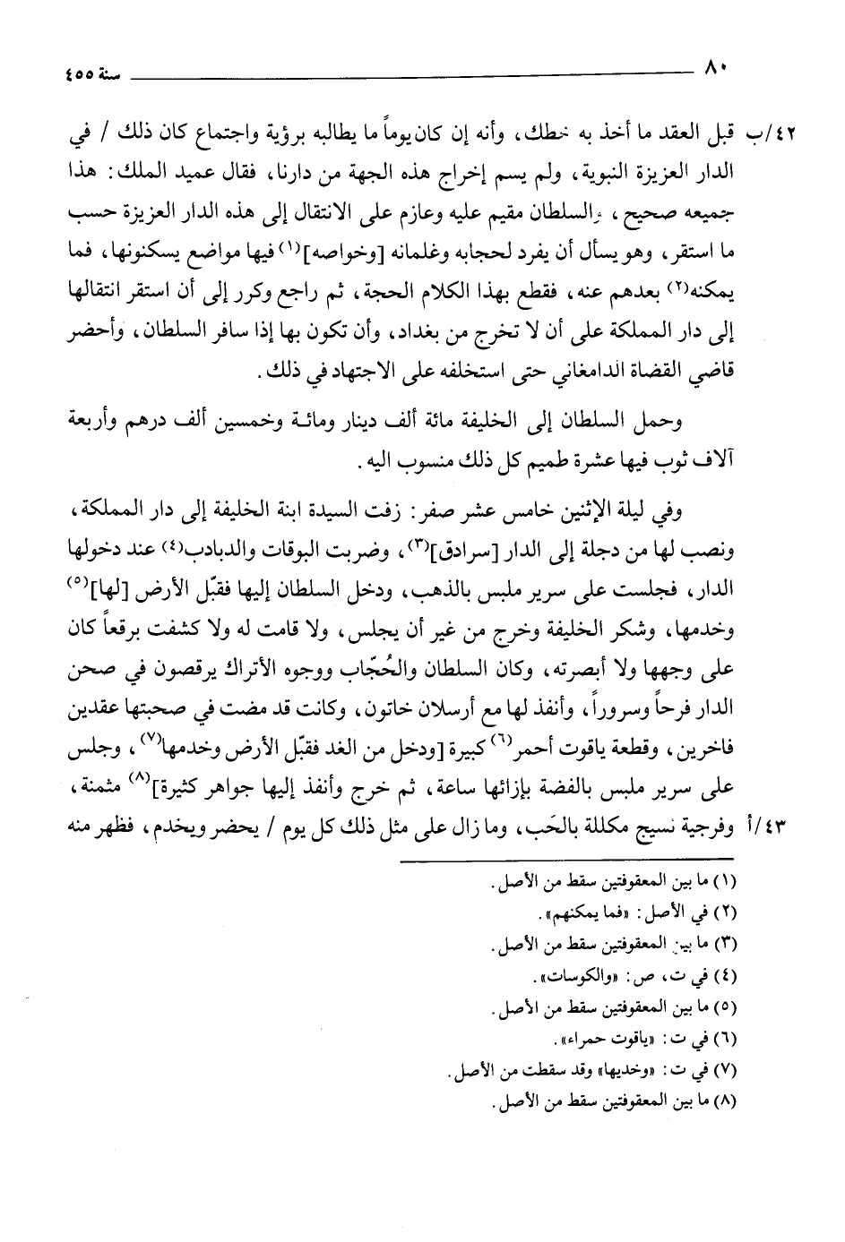 42/ ب قبل العقد ما أخذ به خطك، وأنه إن كان يوما ما يطالبه برؤية واجتماع كان ذلك/ في الدار العزيزة النبوية، ولم يسم إخراج هذه الجهة من دارنا، فقال عميد الملك: هذا جميعه صحيح، والسلطان مقيم عليه وعازم على الانتقال إلى هذه الدار العزيزة حسب ما استقر، وهو يسأل أن يفرد لحجابه وغلمانه [وخواصه] [1] فيها مواضع يسكنونها، فما يمكنه [2] بعدهم عنه، فقطع بهذا الكلام الحجة، ثم راجع وكرر إلى أن استقر انتقالها إلى دار المملكة على أن لا تخرج من بغداد، وأن تكون بها إذا سافر السلطان، وأحضر قاضي القضاة الدامغاني حتى استخلفه على الاجتهاد في ذلك.