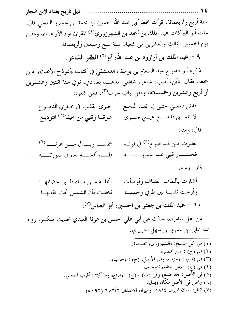 قرأت في كتاب أبي غالب شجاع بن فارس الذهلي بخطه قال: مات أبو عبد الله عبد الملك بن علي بن الخليل في المحرم سنة إحدى وتسعين وأربعمائة.