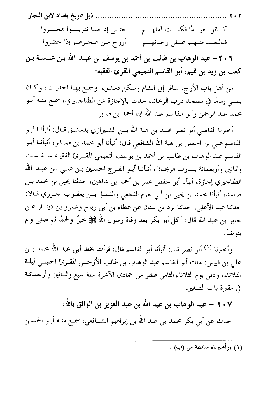 أَخْبَرَنِي عَبْدُ الرَّحْمَنِ بْنُ عُمَرَ [6] الْوَاعِظُ قَالَ: أَنْبَأَنَا عَبْدُ الْوَهَّابِ بْنُ عَبْدِ الْقَادِرِ الْجِيلِيُّ قَالَ: أَنْبَأَنَا أَبُو غَالِبٍ أَحْمَدُ بْنُ الْحَسَنِ بْنِ أَحْمَدَ بْنِ الْبَنَّاءِ، أَنْبَأَنَا أَبُو الحسين محمد ابن أَحْمَدَ بْنِ النَّرْسِيِّ، أَنْبَأَنَا عَلِيُّ بْنُ عُمَرَ الْحَرْبِيُّ قَالَ: قُرِئَ عَلَى حَامِدِ بْنِ مُحَمَّدِ بن