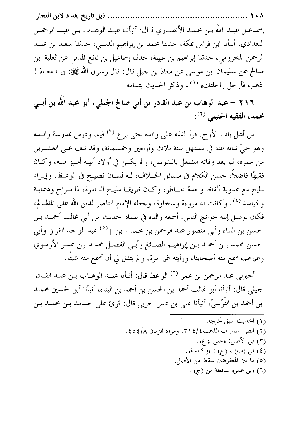 الأدب على أبي محمد بن الخشاب، وصحب جده أبا البركات إسماعيل شيخ الشيوخ فانتفع بصحبته، ولبس منه الخرقة، وتخلق بأخلاقه وتأدب بآدابه، وأخذ علم الحديث ومعرفته من ابن ناصر، وكان كثيرا يحكي عنه من الفوائد الحسنة والنكت الغريبة والمعاني الدقيقة، ومد اللَّه له في العمر حتى حدث بجميع مروياته مرارا، وقصده طلاب العلم من سائر الأقطار، وكانت أوقاته محفوظة، وكلماته معدودة، فلا تمضي له ساعة إلا في قراءة القرآن والذكر والتهجد وقراءة الناس، وكان يمنع الناس من التحديث في مجلسه بلغو أو غيبة إنسان أو ذكر ما لا فائدة فيه، وإذا قرئ [1] عليه الحديث منه أن يقام له، [و] [2] إذا حضر غيره أيضا فلا يقام [3] له، وكان كثير الحج والعمرة والمجاورة بمكة، وكان دائما على سجادته على طهارة مستقبل القبلة، يقرأ القرآن ليلا ونهارا، والمصحف في يده ينظر فيه، وإذا غلبه النوم نام على سجادته، وما استيقظ إلا جدد وضوءا، ولا يخرج من منزله إلا لحضور صلاة [4] الجمعة أو العيد أو جنازة أو زيارة صالح حي أو ميت أو حضور مجلس ذكر، ولم يكن يحضر دور أبناء الدنيا ولا أرباب المناصب في هناء ولا عزاء، وكان مديما للصيام في أكثر أوقاته مع علو سنة، وكان يستعمل السنة في جميع أحواله: في مدخله ومخرجه وملبسه ومأكله ومشربه، ويحب الصالحين، ويقتفي بسيرة السلف عقدا وفعلا، ويعظم العلماء، ويستفيد من الكبير والصغير ويتواضع لجميع الناس وفي سائر أحواله، وكان دائما يقول: نسأل اللَّه [أن] [5] يميتنا مسلمين! وإذا دعا له أحد بطول البقاء قال: أسأل اللَّه الوفاة على الإسلام، ويبكي. وكان ظاهر الخشوع عند الذكر، غزير الدمعة عند قراءة القرآن والحديث وأخبار الصالحين.
