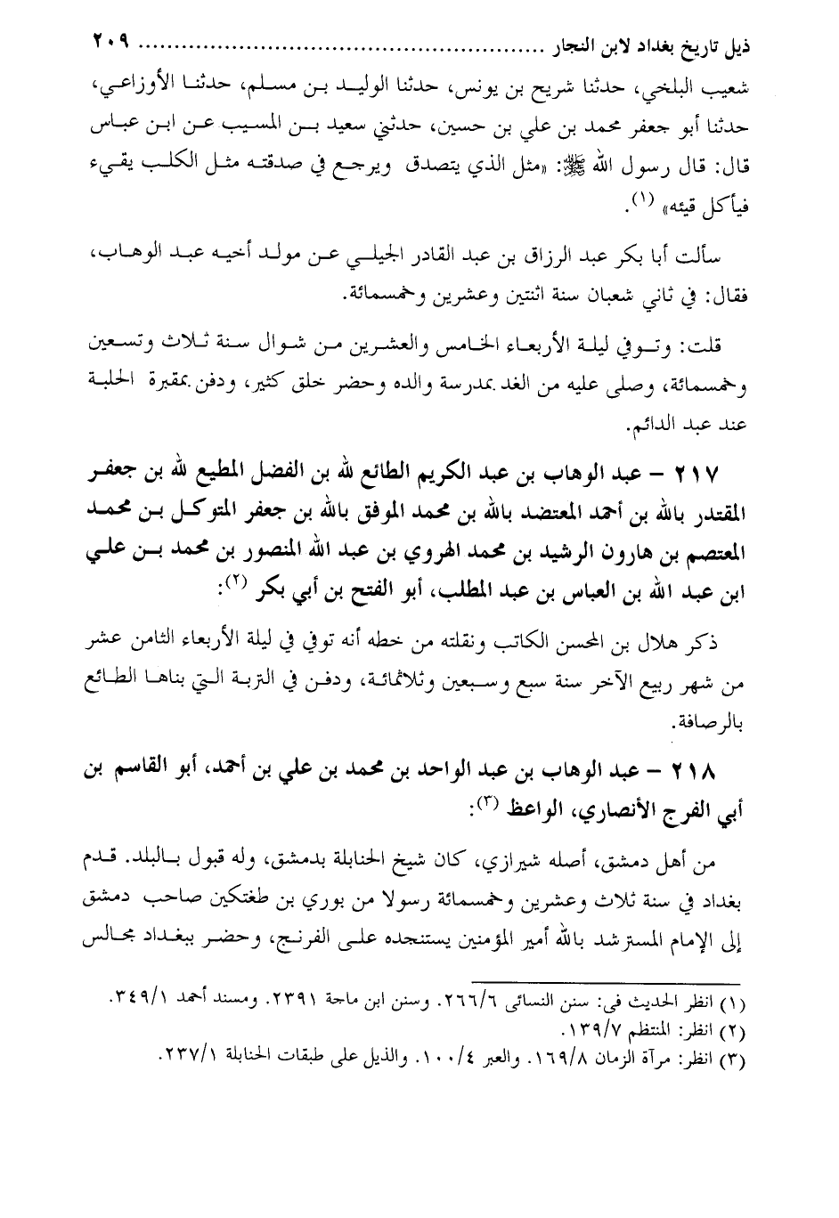 أَخْبَرَنَا شَيْخُنَا السَّعِيدُ أبو أحمد عَبْد الوهاب بْن عليّ بْن عَلِيِّ بْن عُبَيْدِ اللَّهِ [3] قِرَاءَةً عَلَيْهِ وَأَنَا أَسْمَعُ قَالَ: أَنْبَأَنَا أَبُو الْقَاسِمِ هِبَةُ اللَّهِ بن محمد بن عبد الواحد بن الحصين بِقِرَاءَةِ شَيْخِنَا أَبِي الْفَضْلِ بْنِ نَاصِرٍ عَلَيْهِ وَأَنَا أَسْمَعُ فِي جُمَادَى الآخِرَةِ سَنَةَ خَمْسٍ وعشرين وخمسمائة، أنبأنا أَبُو طَالِبٍ مُحَمَّدُ بْنُ مُحَمَّدِ بْنِ إِبْرَاهِيمَ بْنِ غَيْلانَ الْبَزَّازُ قِرَاءَةً عَلَيْهِ فِي سنة سبع وثلاثين وأربعمائة، حَدَّثَنَا أَبُو بَكْرٍ مُحَمَّد بْن عَبْد اللَّهِ بْنِ إبراهيم الشافعي، حدثنا أَبُو بَكْر أَحْمَد بْن عُبَيْد اللَّهِ النَّرْسِيُّ، أنبأنا روح بن عبادة، حدثنا عثمان بن غياث، حدثنا أَبُو نَضْرَةَ عَنْ أَبِي سَعِيدٍ الْخُدْرِيِّ عَنِ النَّبِيِّ صَلَّى اللَّهُ عَلَيْهِ وَسَلَّمَ أَنَّهُ قَالَ: «يَمُرُّ النَّاسُ عَلَى جِسْرِ جَهَنَّمَ، وَعَلَيْهِ حَسَكٌ وَكَلالِيبُ وَخَطَاطِيفُ تَخْطَفُ النَّاسَ يَمِينًا وَشِمَالا وَبِجَنْبَتَيْهِ مَلائِكَةٌ يَقُولُونَ: اللَّهُمَّ سَلِّمْ سَلِّمْ، فَمِنَ النَّاسِ مَنْ يَمُرُّ مِثْلَ الْبَرْقِ، وَمِنْهُمْ مَنْ يَمُرُّ مِثْلَ الرِّيحِ، وَمِنْهُمْ مَنْ يَمُرُّ مِثْلَ الْفَرَسِ الْمُجْرِي، وَمِنْهُمْ مَنْ يَسْعَى سَعْيًا، وَمِنْهُمْ مَنْ يَحْبُو حَبْوًا، وَمِنْهُمْ مَنْ يَزْحَفُ زَحْفًا؛ فَأَمَّا أَهْلُ النَّارِ الَّذِينَ هُمْ أَهْلُهَا فَلا يَمُوتُونَ ولا يحيون،