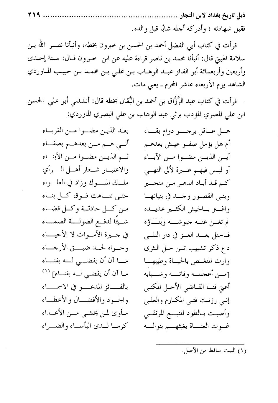 أَخْبَرَنَا أَبُو أَحْمَد عَبْد الْوَهَّابِ بْن عَلِيٍّ الأَمِينُ قَالَ: أَنْبَأَنَا أبو البركات عبد الوهاب ابن الْمُبَارَكِ الأَنْمَاطِيُّ وَوَالِدِي قَالا: أَنْبَأَنَا عَبْدُ اللَّهِ بن محمد الصريفيني، أنبأنا عبيد الله